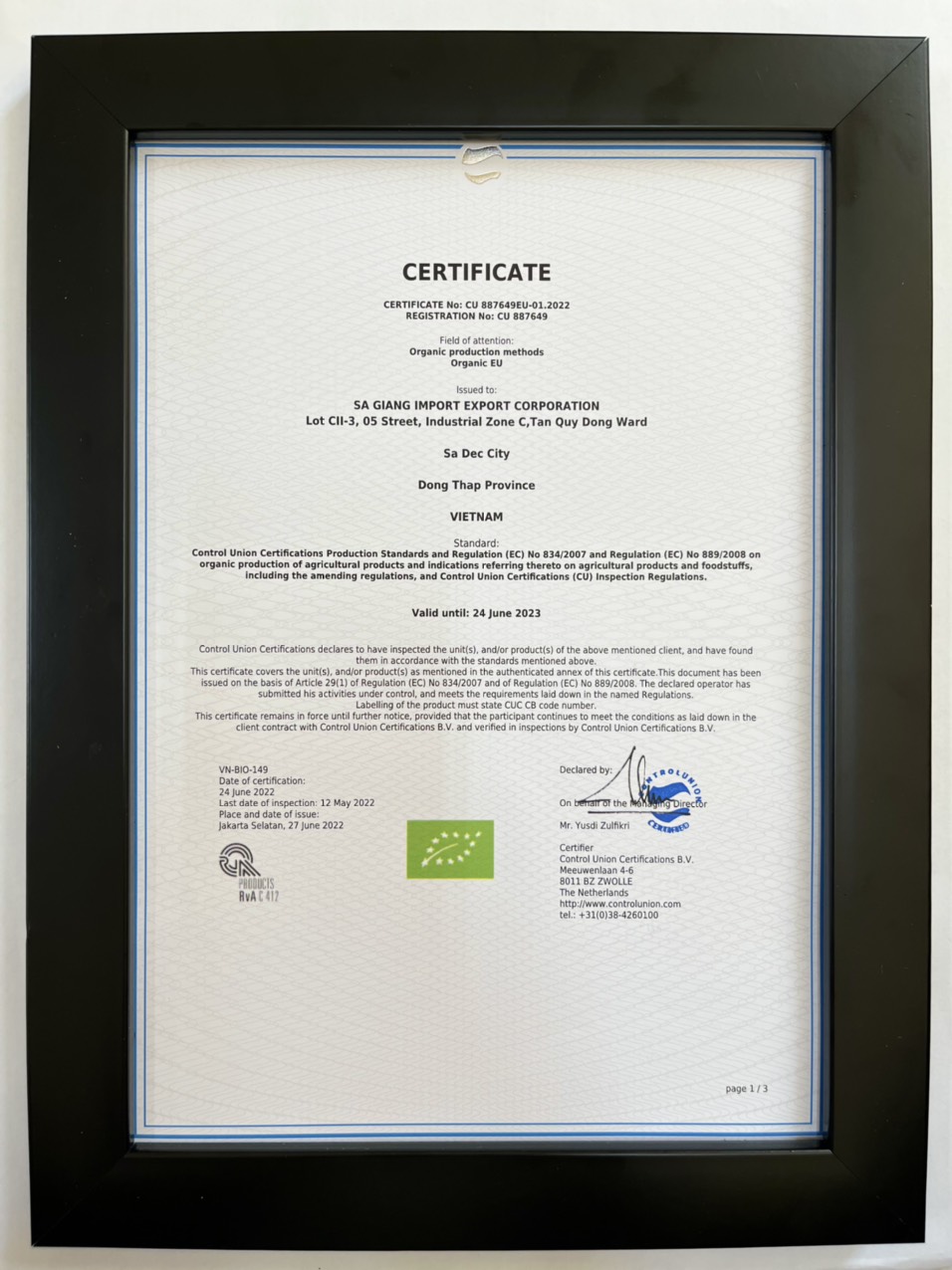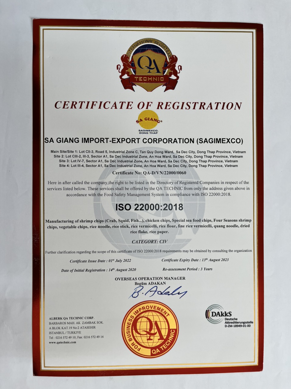 Công ty Cổ phần Xuất nhập khẩu Sa Giang sở hữu hệ thống chứng nhận và tiêu chuẩn quốc tế uy tín như Halal, BSCI, USDA Organic, ASC, FDA và ISO 22000:2018.