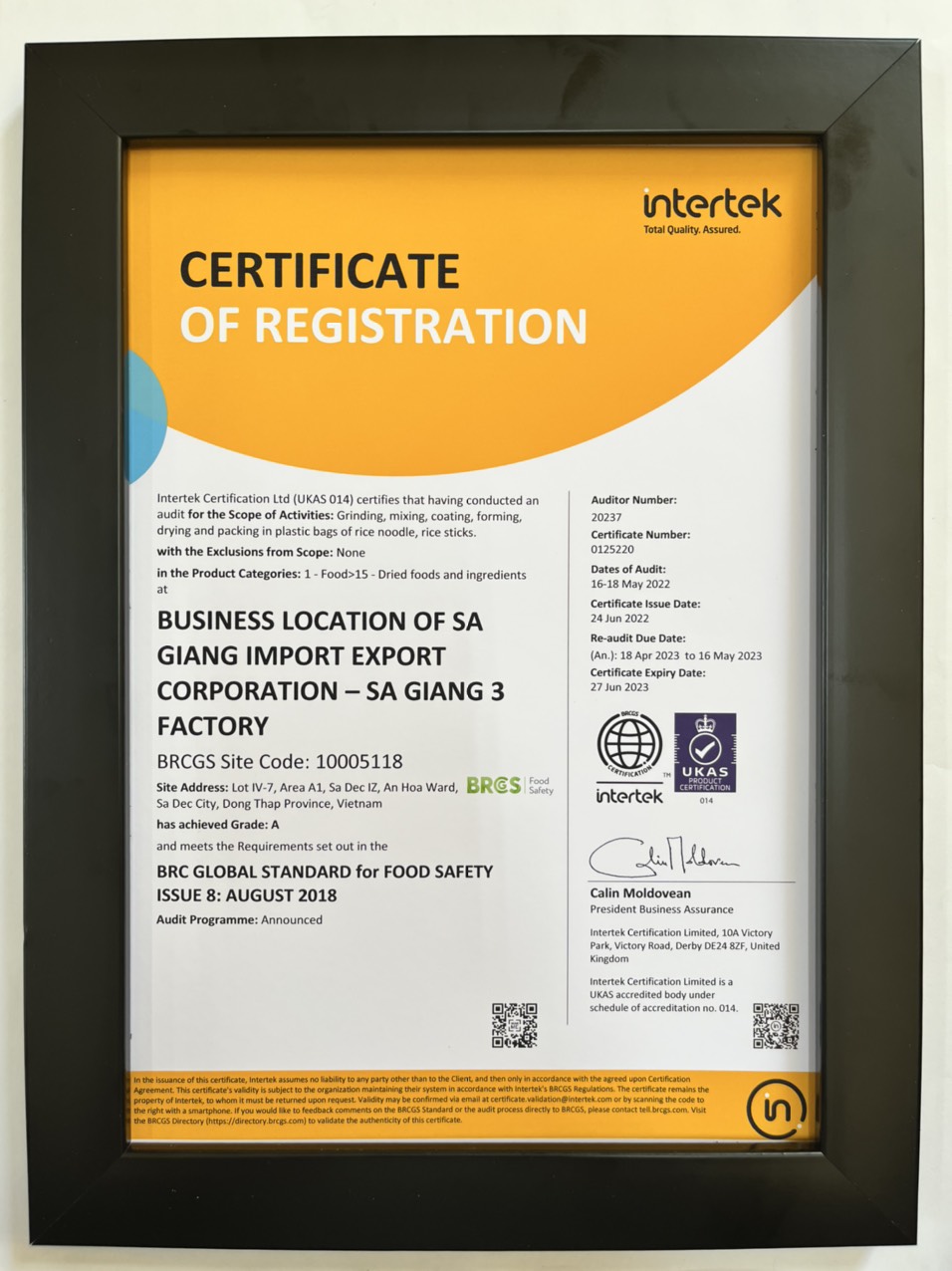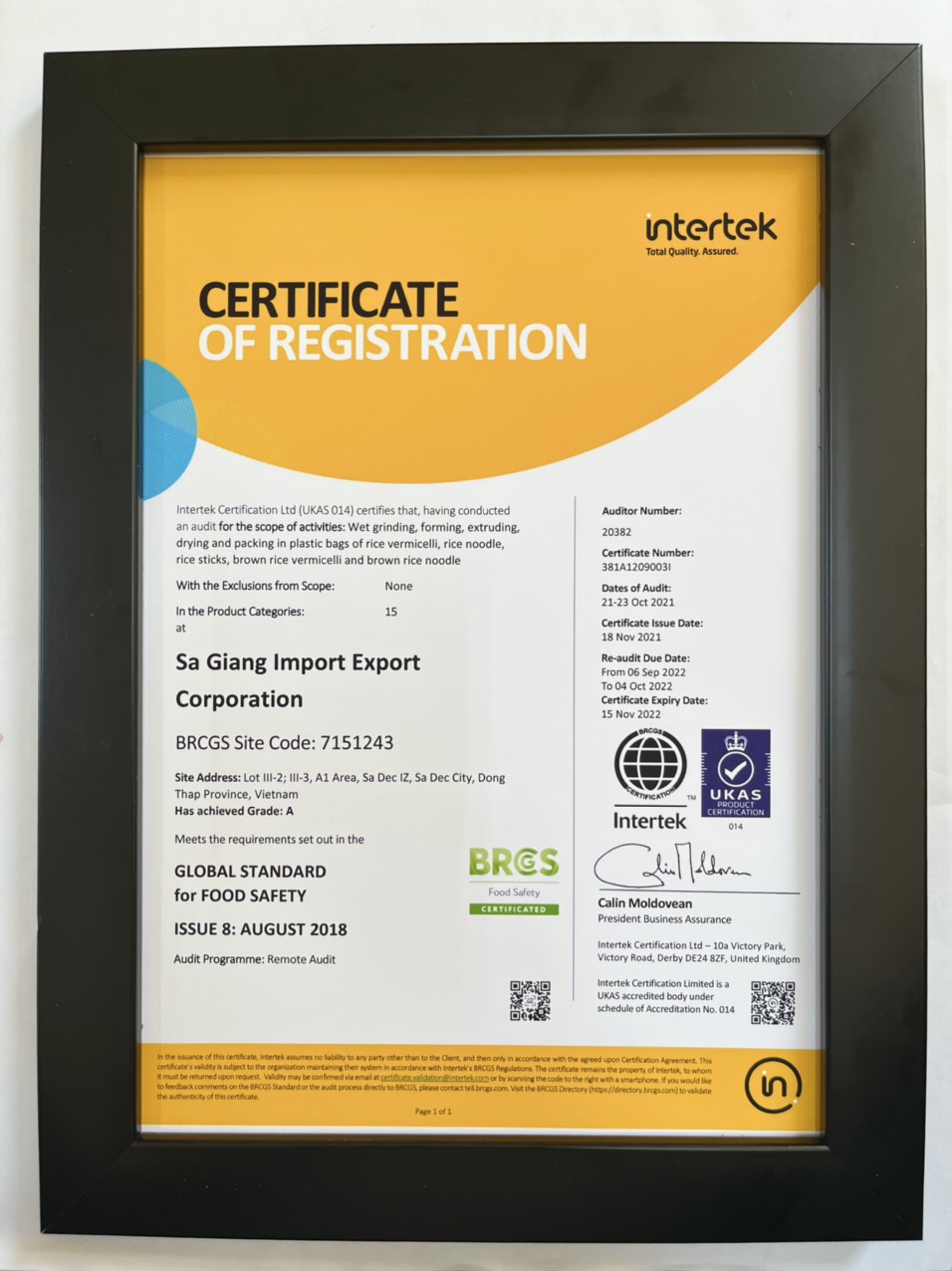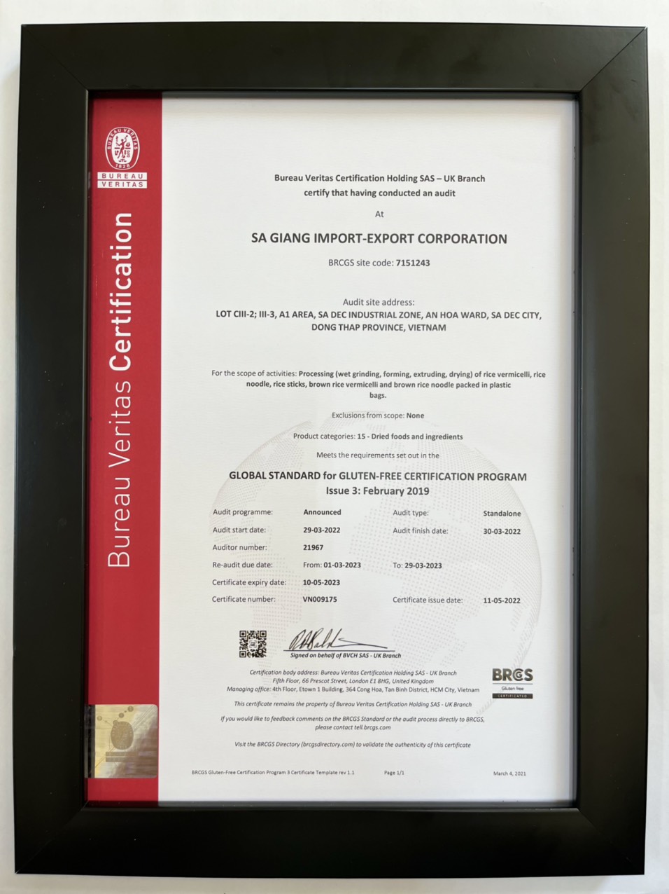 Các chứng nhận này khẳng định năng lực quản lý chất lượng, an toàn thực phẩm và trách nhiệm xã hội của Sa Giang, đáp ứng yêu cầu nghiêm ngặt của nhiều thị trường quốc tế.