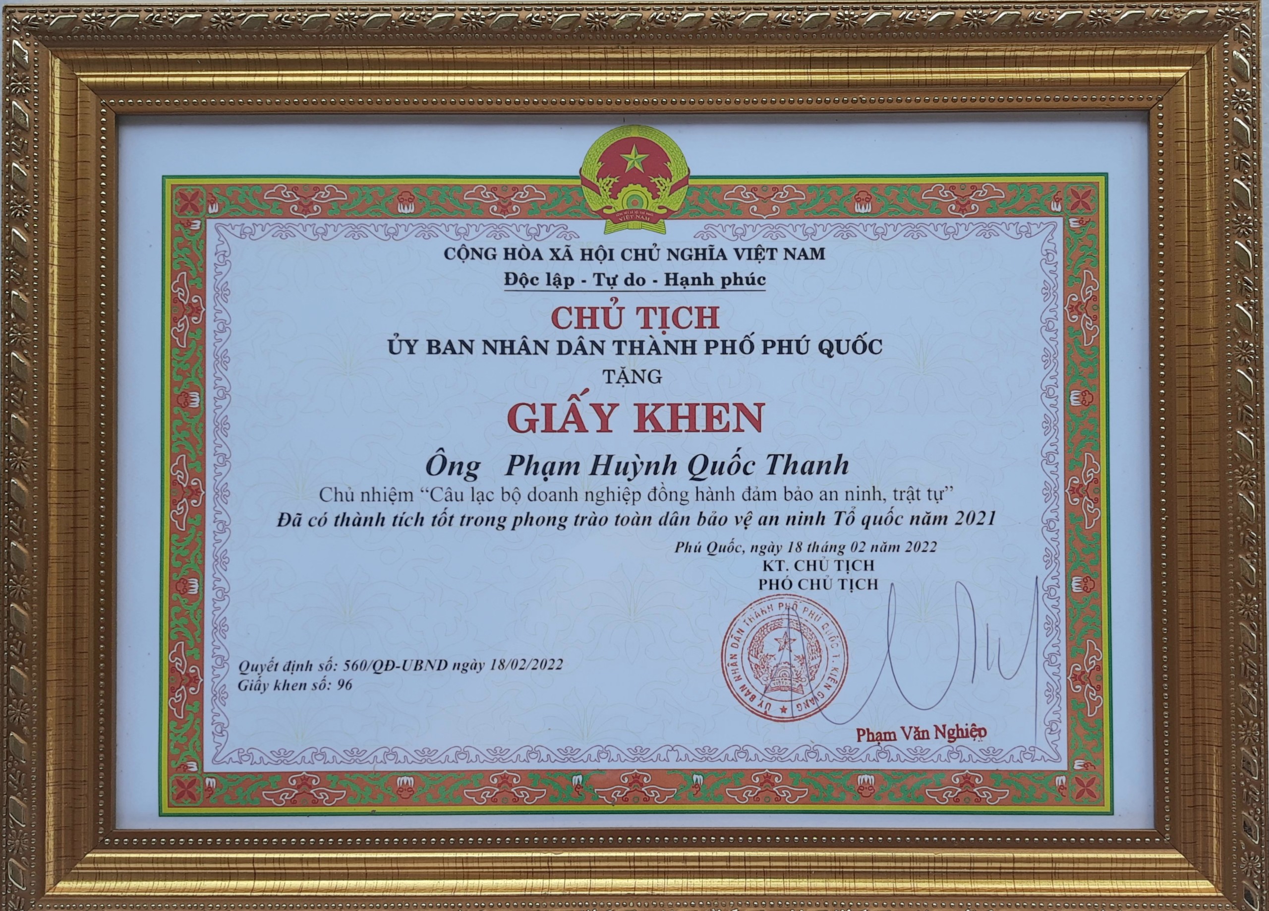 - Đã có thành tích tốt trong xây dựng, quản lý và phát triển Hội nước mắm thành phố Phú Quốc nhiệm kỳ IV (2016-2021)