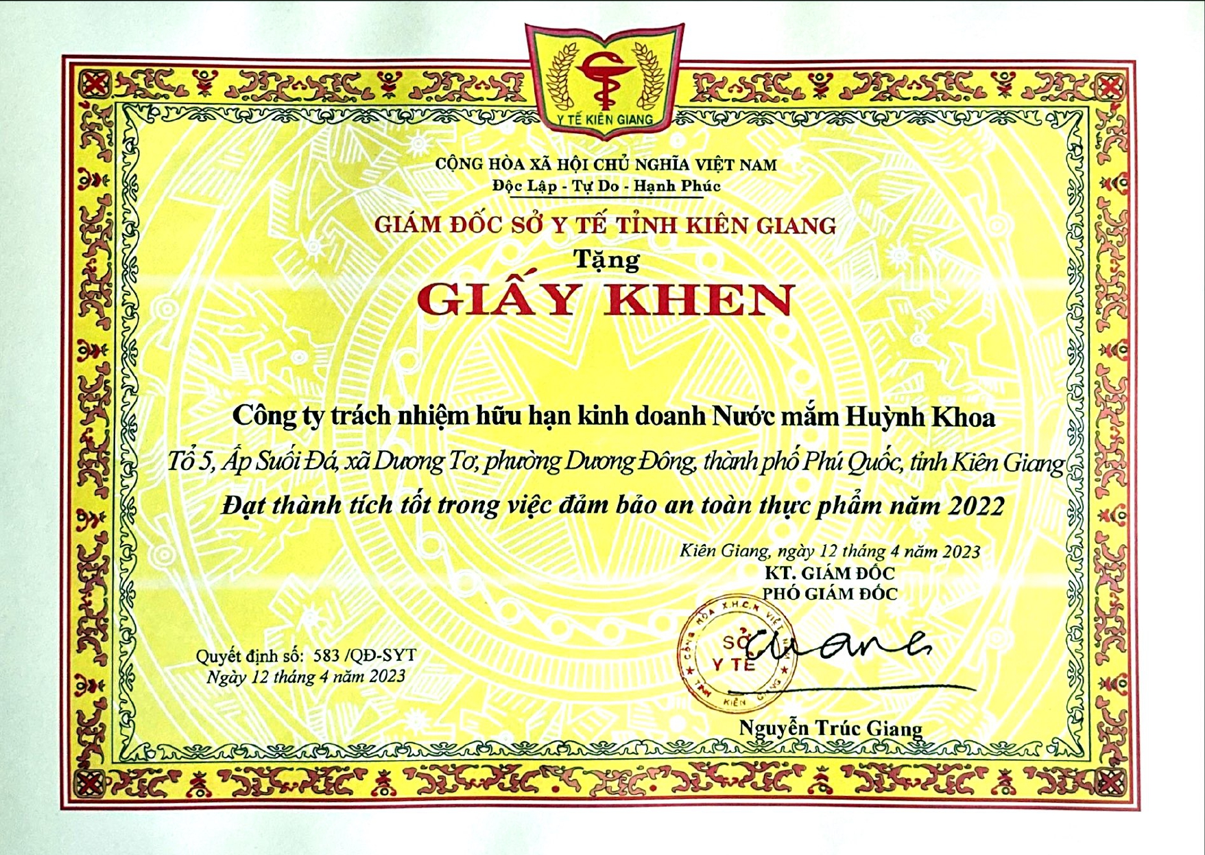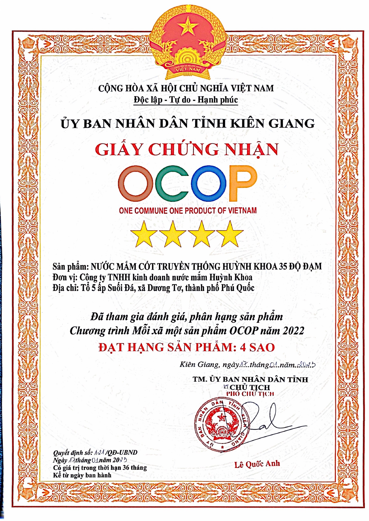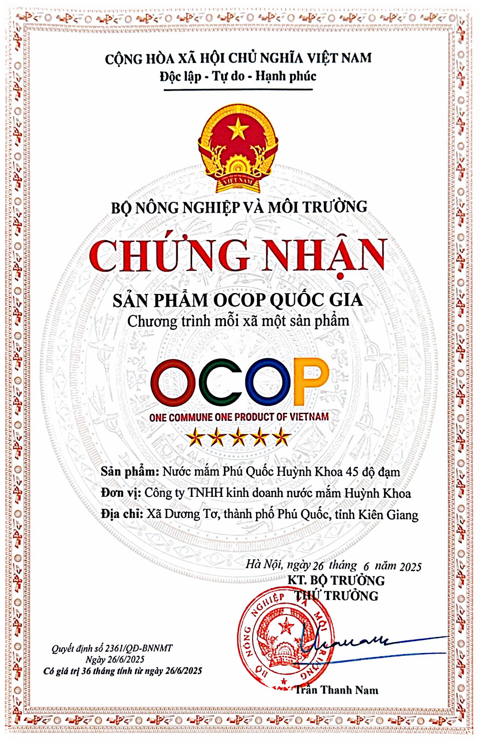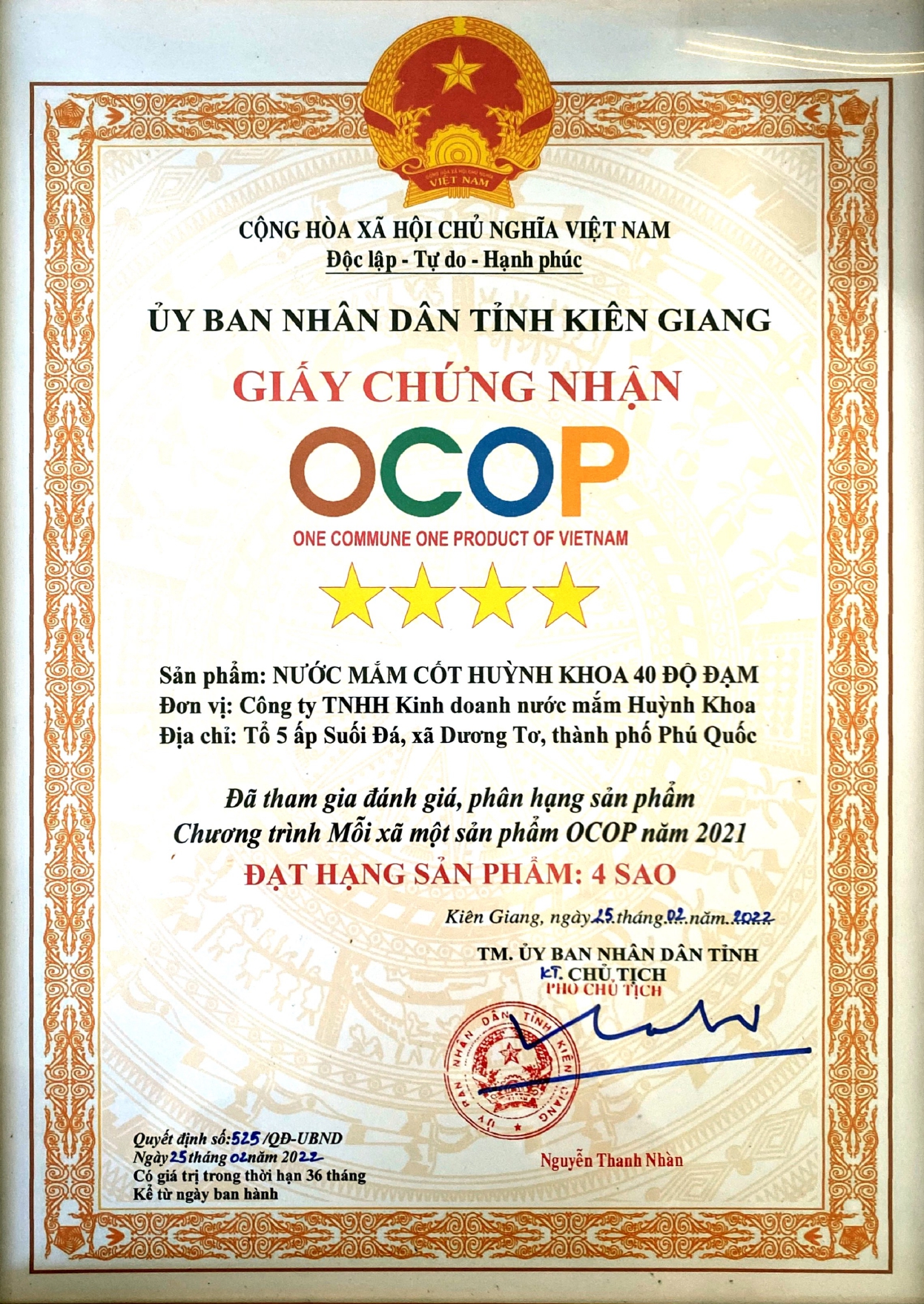 Với hơn 40 năm bền bỉ gìn giữ và phát triển hương vị nước mắm truyền thống, tập thể Nhà thùng Nước mắm Truyền thống Huỳnh Khoa Phú Quốc chính thức đón nhận Chứng nhận OCOP 5 sao cấp quốc gia cho các dòng sản phẩm nước mắm độ đạm cao: 40 – 43 – 45 độ đạm.