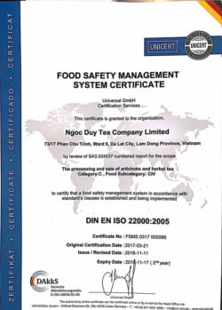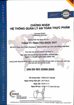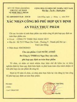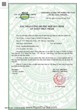 Nhà máy sản xuất Trà Ngọc Duy có đầy đủ các chứng nhận liên quan đến Vệ sinh an toàn thực phẩm. Mỗi sản phẩm đều có bộ hồ sơ công bố riêng, quý khách hàng có thể tham khảo trên website, dưới đây là 1 số chứng nhận của Nhà máy sản xuất Trà Ngọc Duy.