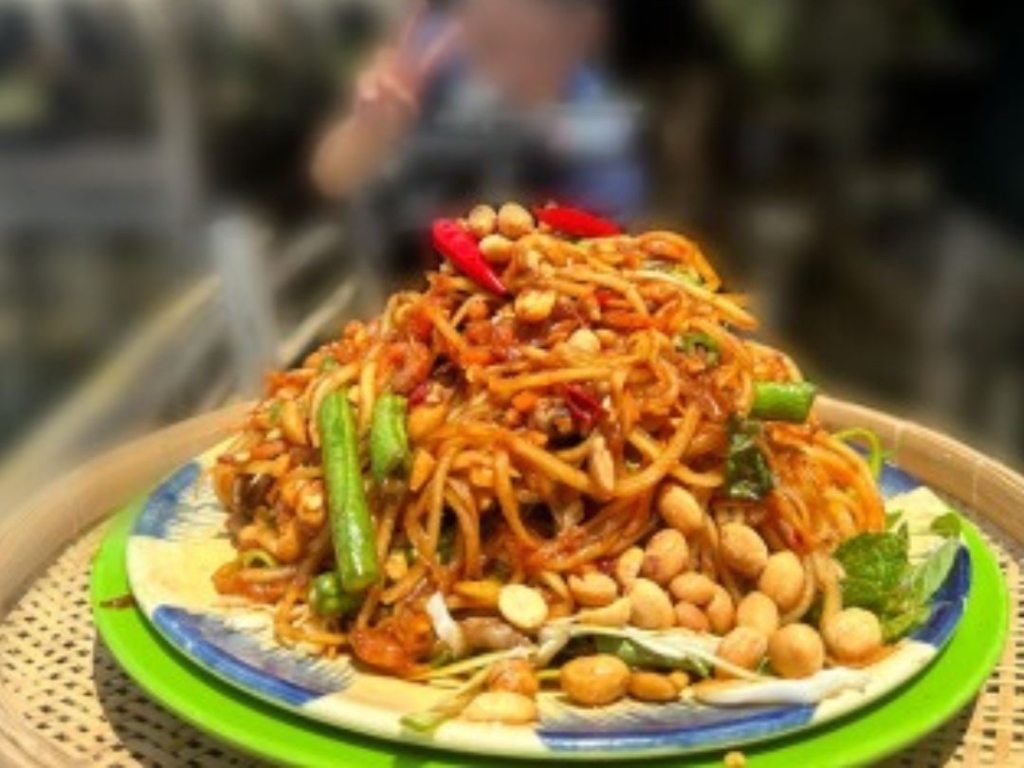 Đây là món gỏi đu đủ trộn kiểu Khmer, có nguồn gốc từ ẩm thực Campuchia, Thái Lan, nhưng khi về Hà Tiên, người dân địa phương đã biến tấu lại cho hợp khẩu vị miền biển, tạo nên một hương vị rất riêng, không nơi nào có được.