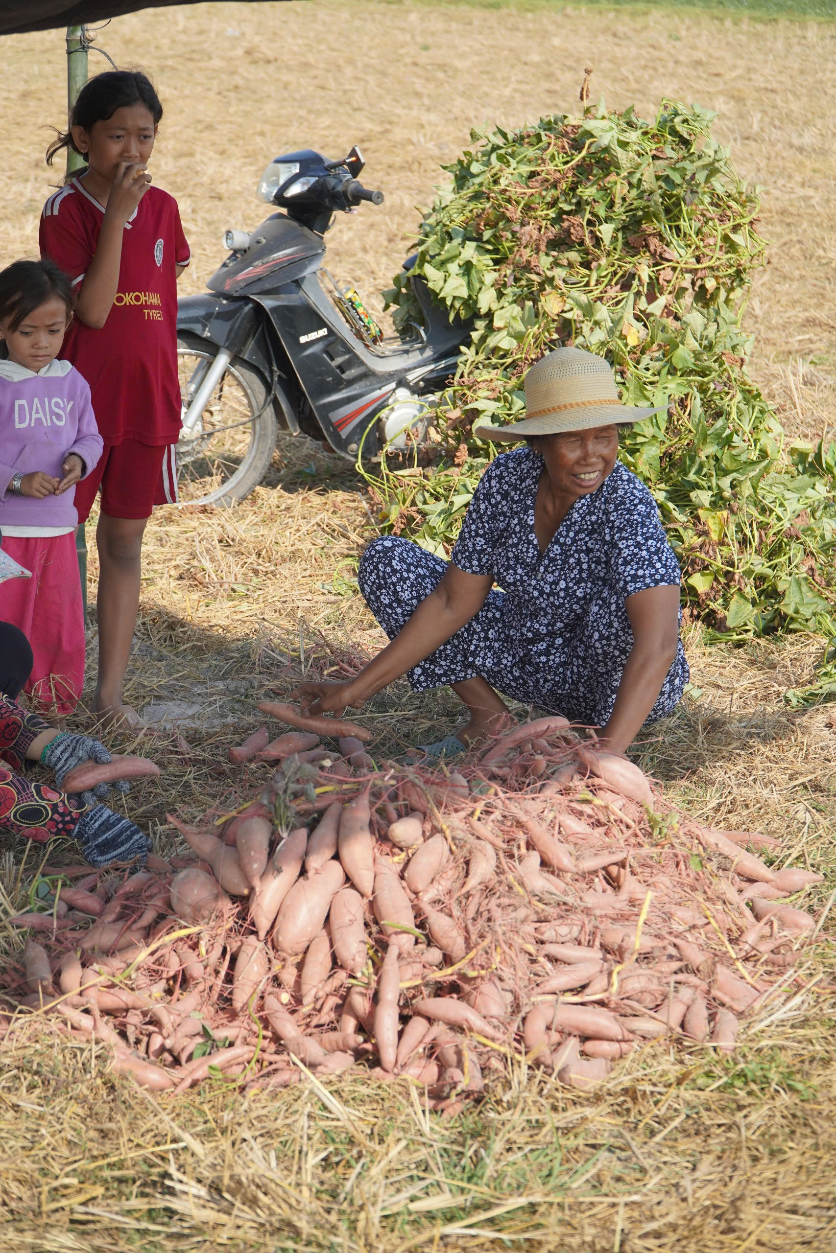 Khoai lang Mỹ Đức thường được xuống giống vào cuối năm hoặc những ngày đầu năm mới. Thời tiết khô ráo, ít mưa là điều kiện lý tưởng để khoai phát triển. Chỉ sau khoảng hai đến ba tháng chăm sóc, khoai bắt đầu cho thu hoạch. Trên các cánh đồng, từng củ khoai được đào lên từ lớp cát mịn, căng tròn và chắc nịch. Đó là thành quả của bao ngày lao động cần mẫn của người nông dân.