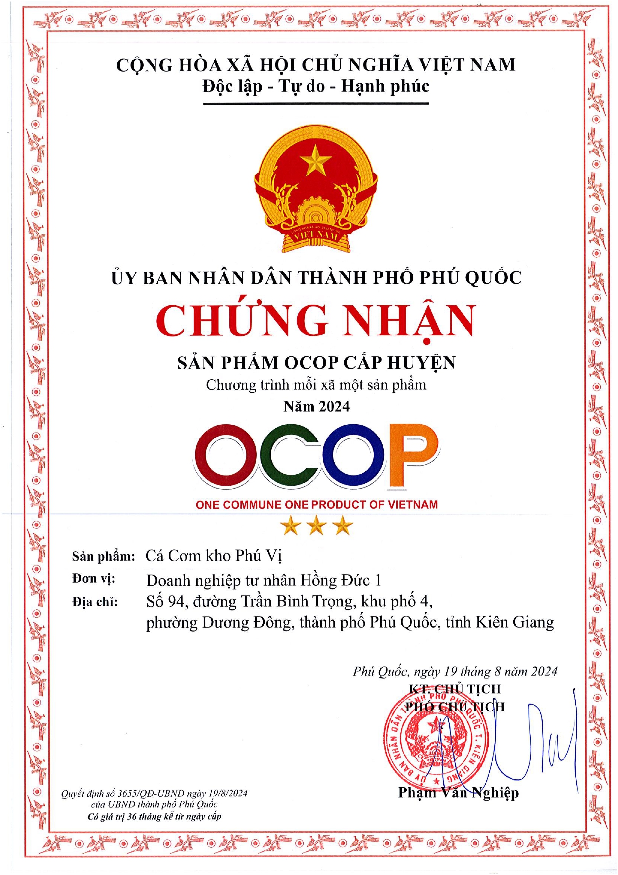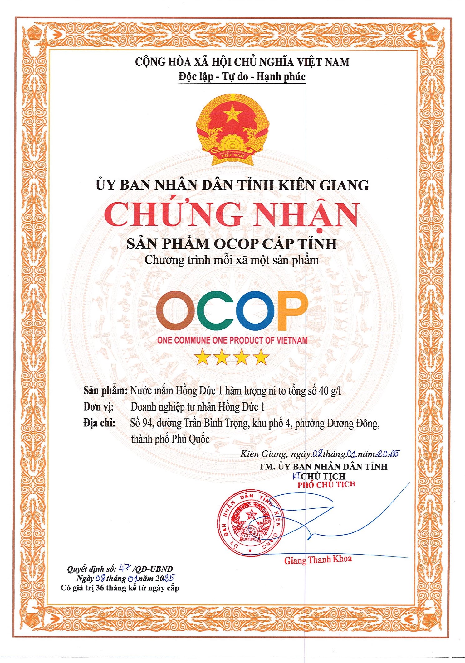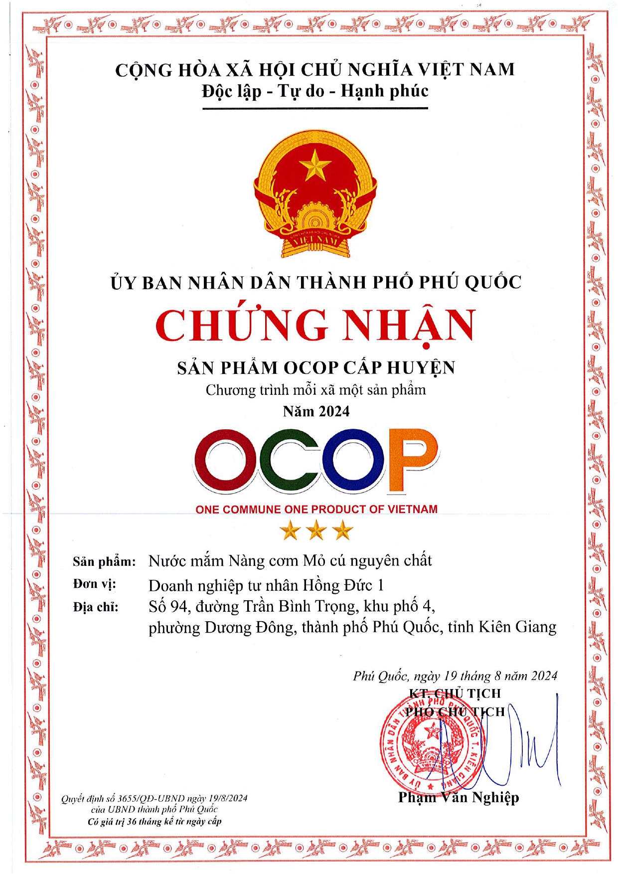 - Chứng nhận OCOP 3 sao: khẳng định chất lượng, độ an toàn và uy tín của nước mắm Phú Quốc Hồng Đức 1 trên hành trình đưa hương vị Việt vươn ra thế giới.