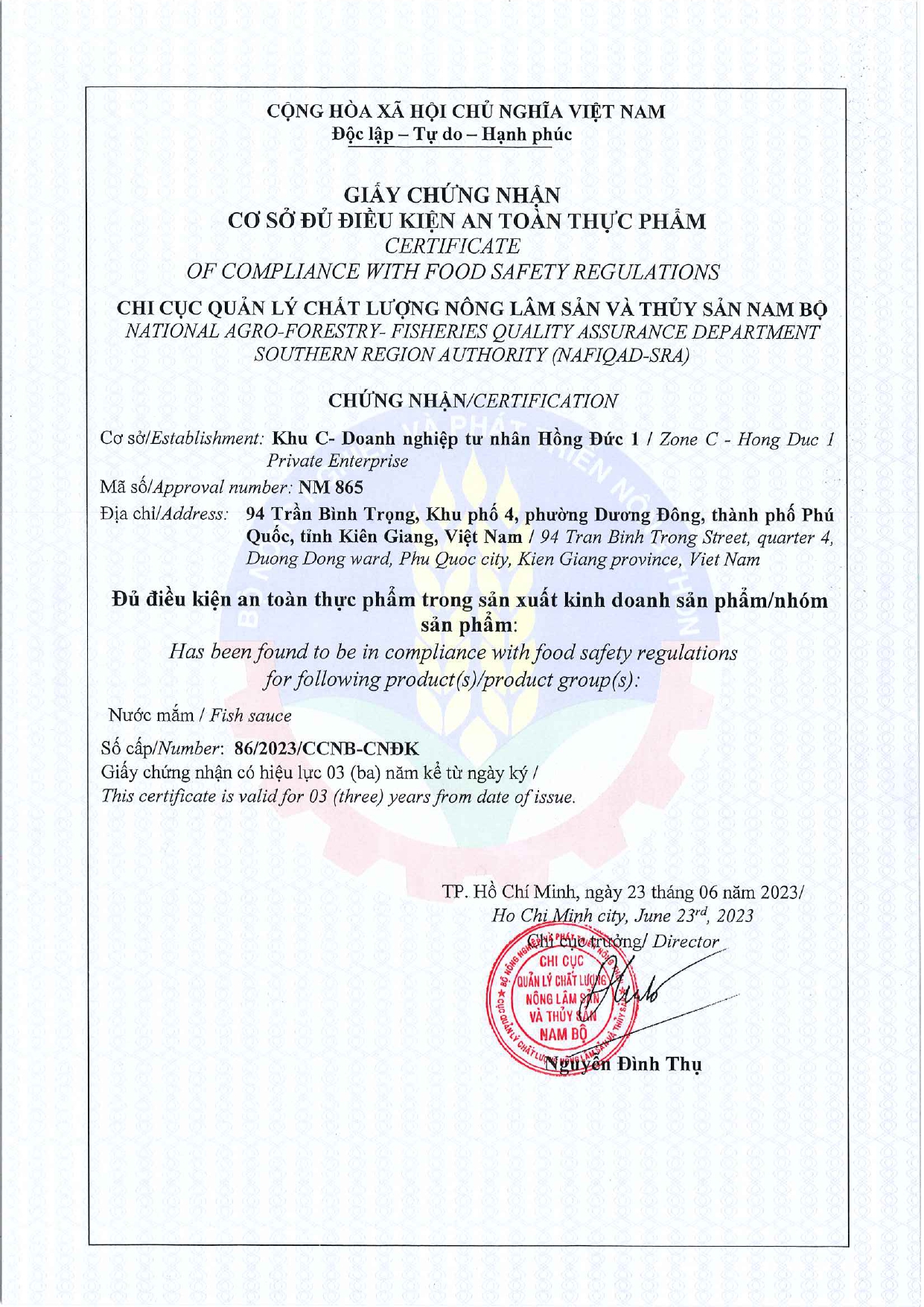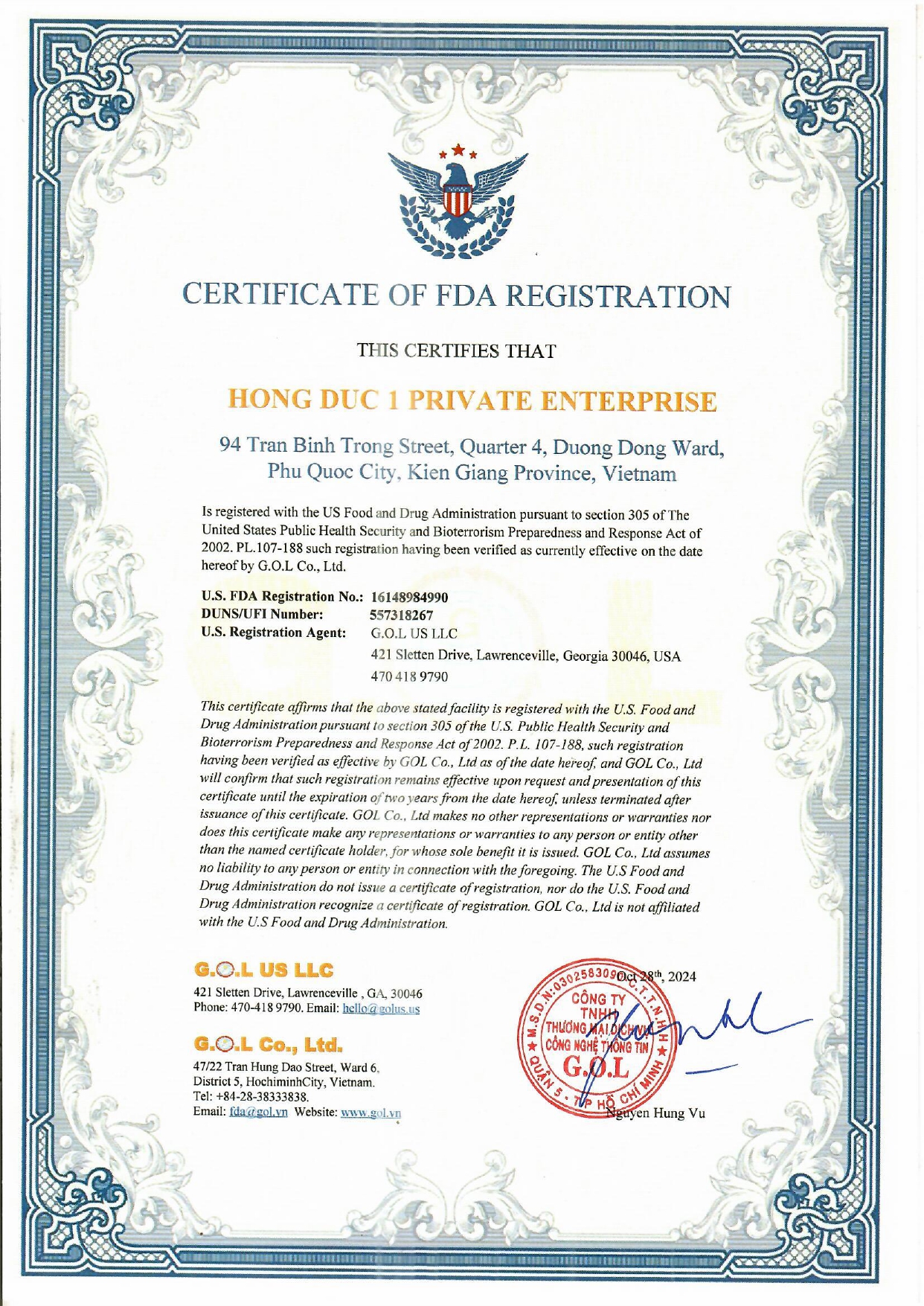 - Chứng nhận FDA: đủ điều kiện xuất khẩu vào thị trường Hoa Kỳ;