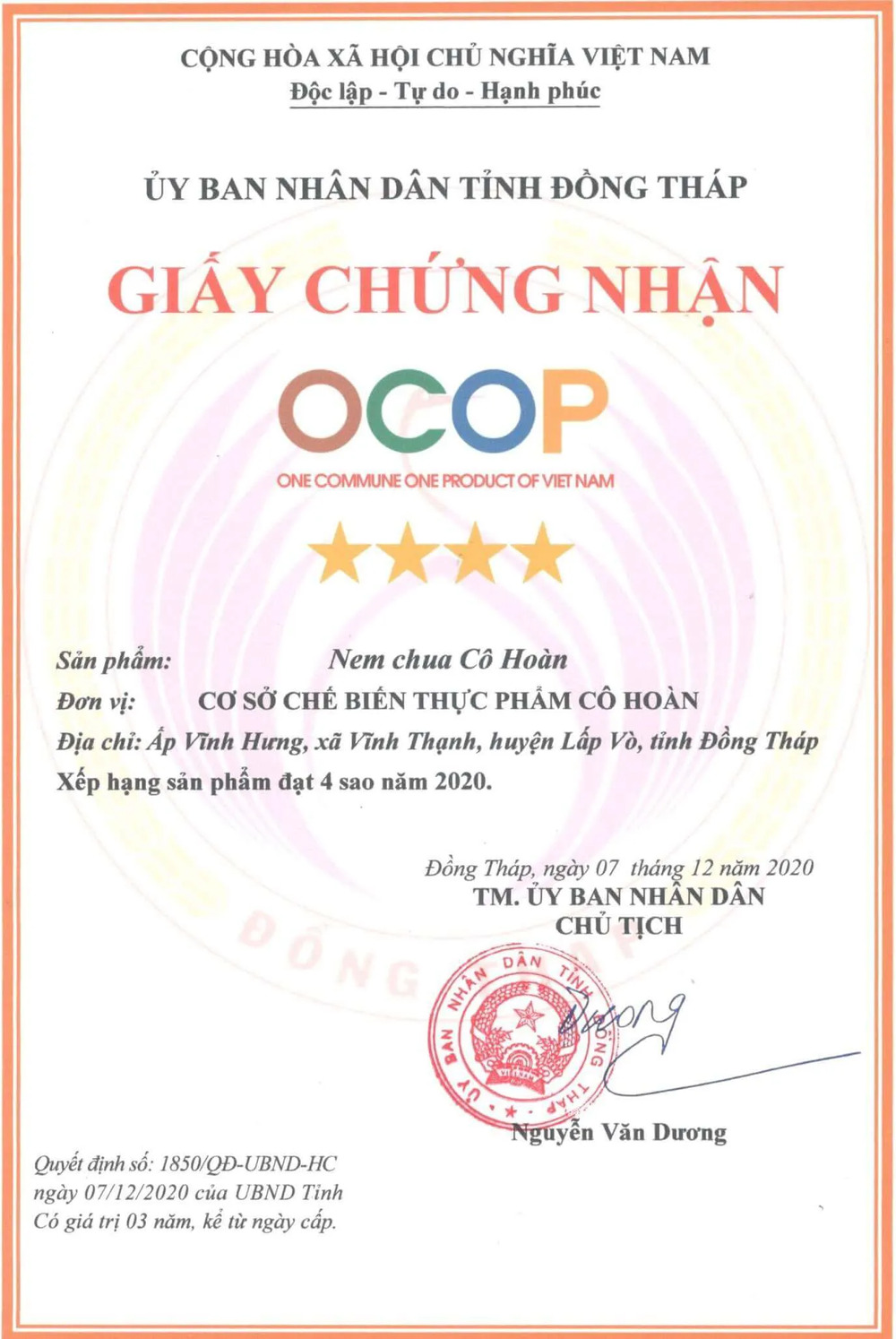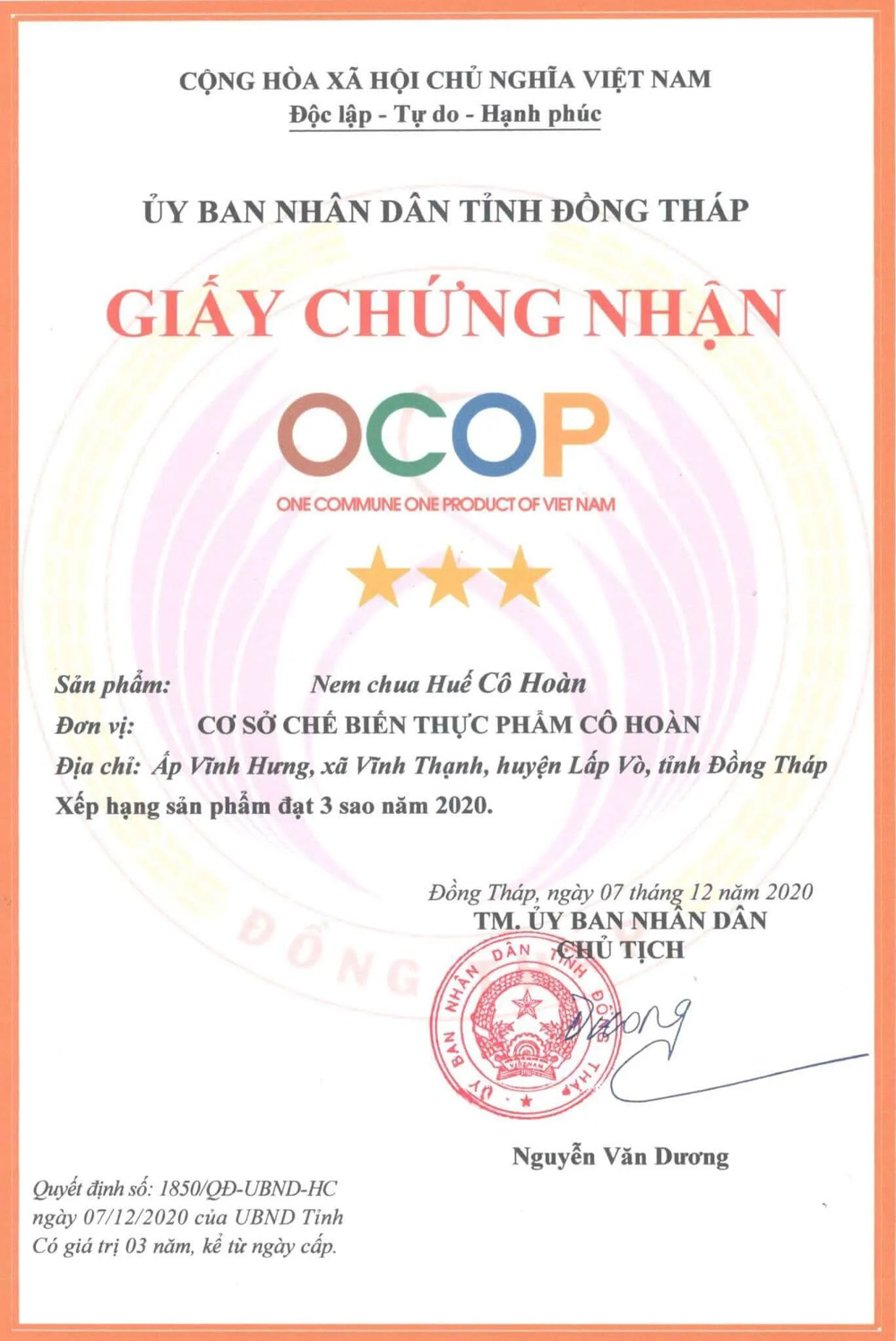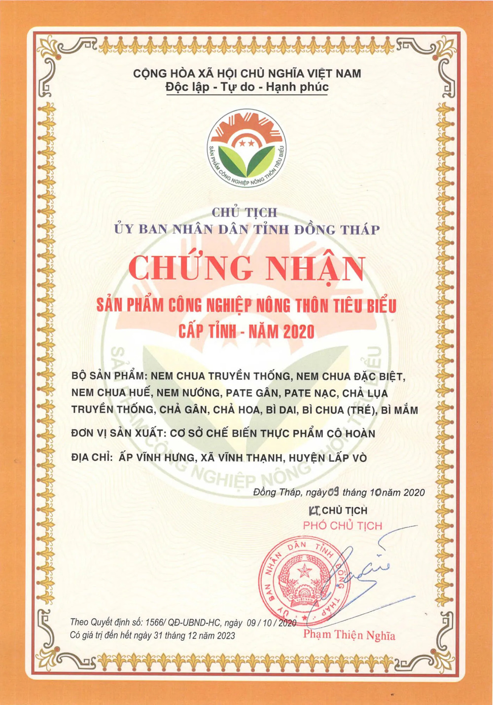 - Năm 2002 thương hiệu “Nem Cô Hoàn” đã mở rộng kinh doanh thành Cơ sở Chế biến thực phẩm Cô Hoàn và hiện tại cơ sở của cô có đến 10 sản phẩm đạt giấy chứng nhận OCOP, được nhiều giấy khen, bằng khen của Huyện, của tỉnh Đồng Tháp quê nhà.