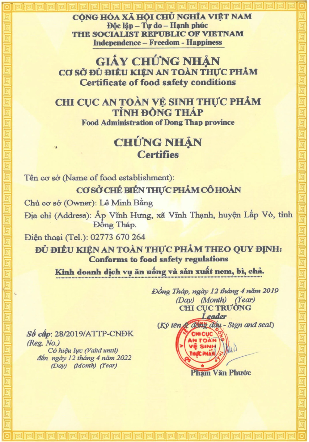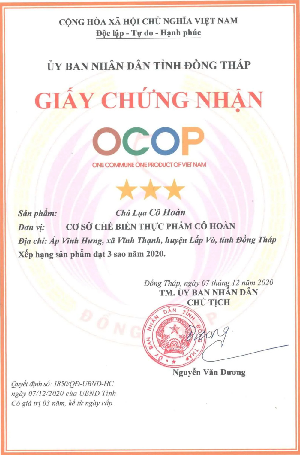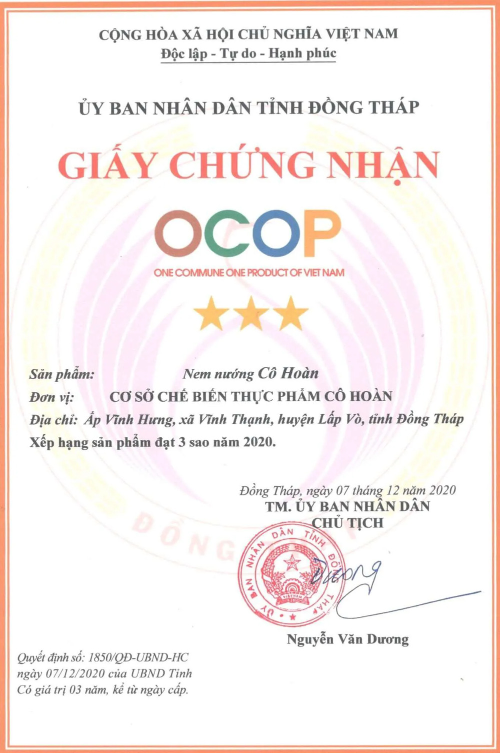 - Năm 2002 thương hiệu “Nem Cô Hoàn” đã mở rộng kinh doanh thành Cơ sở Chế biến thực phẩm Cô Hoàn và hiện tại cơ sở của cô có đến 10 sản phẩm đạt giấy chứng nhận OCOP, được nhiều giấy khen, bằng khen của Huyện, của tỉnh Đồng Tháp quê nhà.