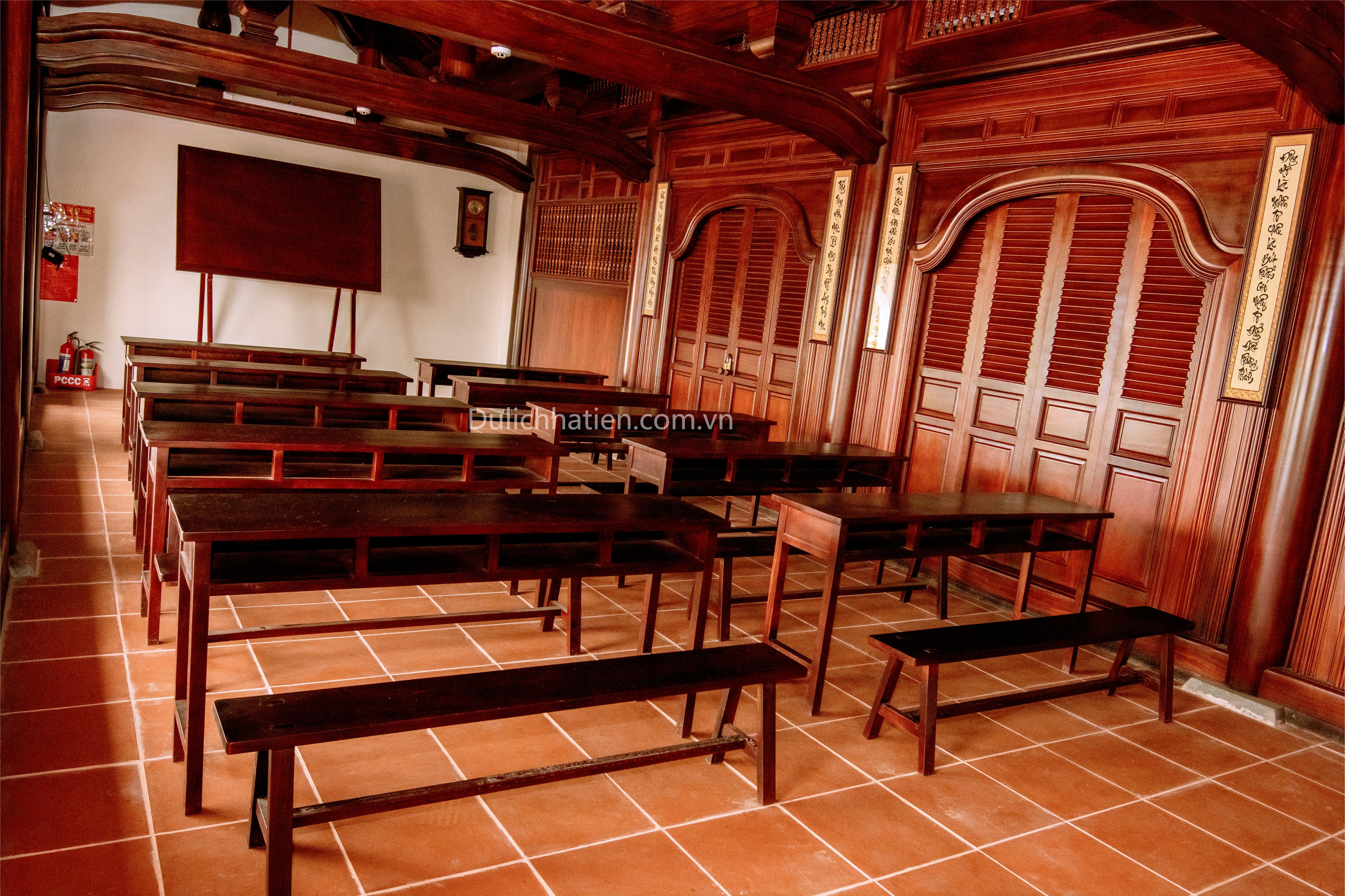 Bên trong Trí đức học xá, không gian tái hiện lại lớp học chữ quốc ngữ xưa do Đông Hồ giảng dạy, với bàn học bảng đen, các câu đối, châm ngôn của các nhà văn nổi tiếng.