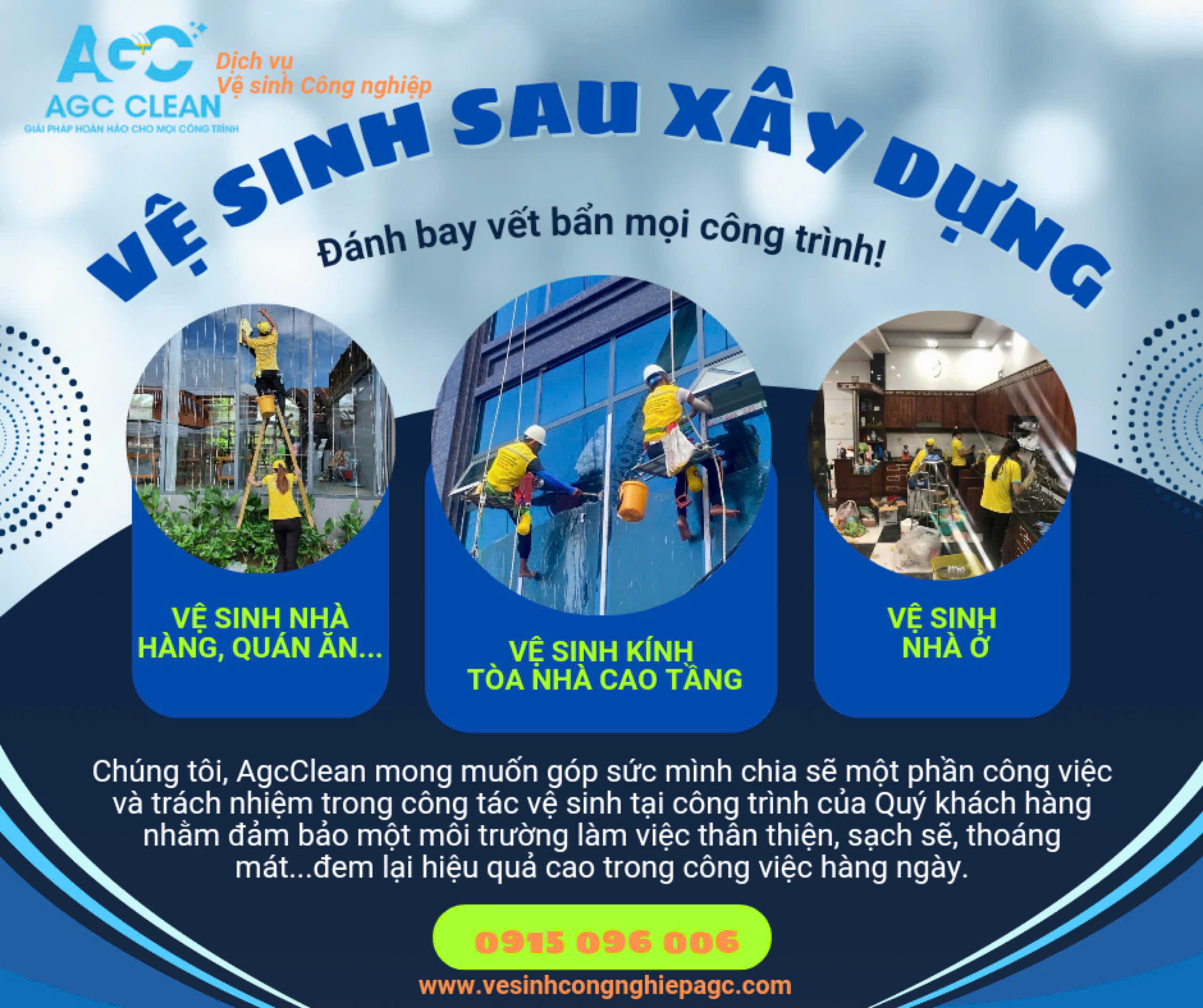 Vệ sinh sau xây dựng: Sau khi hoàn thiện công trình xây dựng, AGC cung cấp dịch vụ vệ sinh toàn diện để loại bỏ bụi bẩn, vết sơn, vết xi măng và các chất bẩn khác, giúp không gian sạch sẽ và sẵn sàng cho sử dụng.