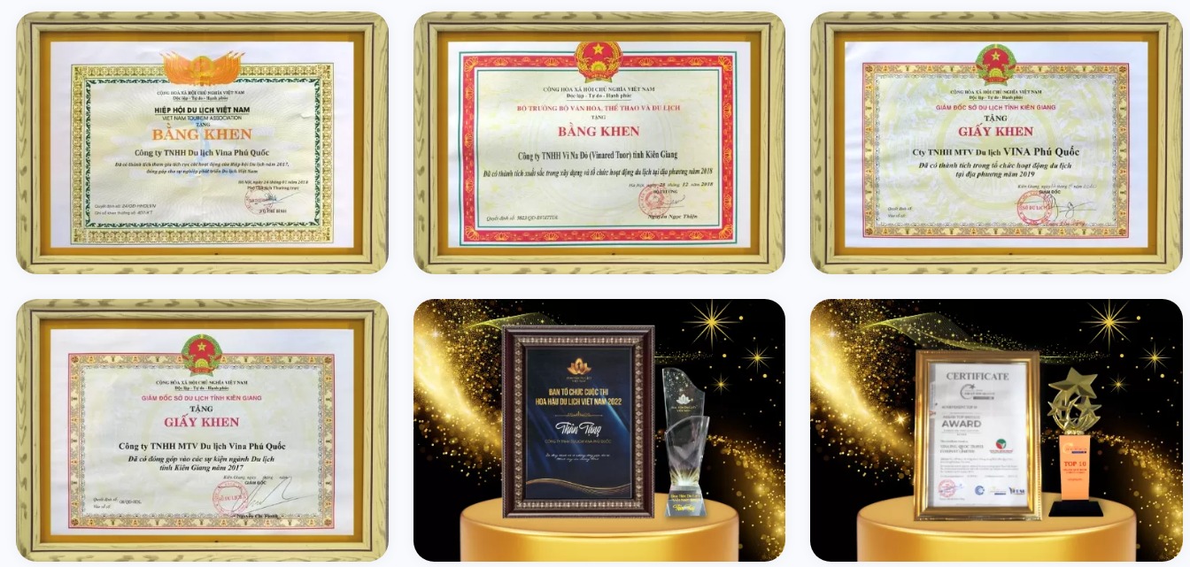 VINA Phú Quốc đã khẳng định được chất lượng dịch vụ, thương hiệu khi vinh dự là đơn vị đầu tiên tiên phong tổ chức tiếp đón đoàn quốc tế đến với đảo ngọc. Đạt được danh hiệu top 100 thương hiệu vàng Châu Á và nhận được bằng khen “Giám đốc Lữ hành tiêu biểu năm 2019” của Hiệp hội du lịch Việt Nam.