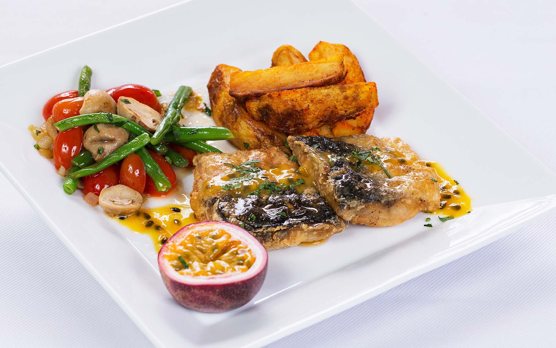 Các đầu bếp tại Nhà hàng Kim Hoa đã làm nên thực đơn vô cùng phong phú với nguyên liệu đa dạng, cấu trúc và hương vị độc đáo, tất cả được truyền cảm hứng từ cảnh quan thiên nhiên. Nhà hàng Kim Hoa phục vụ những món ăn truyền thống Việt Nam với những biến tấu hiện đại và đặc biệt là các món nướng tươi ngon từ hải sản chế biến tại chỗ.