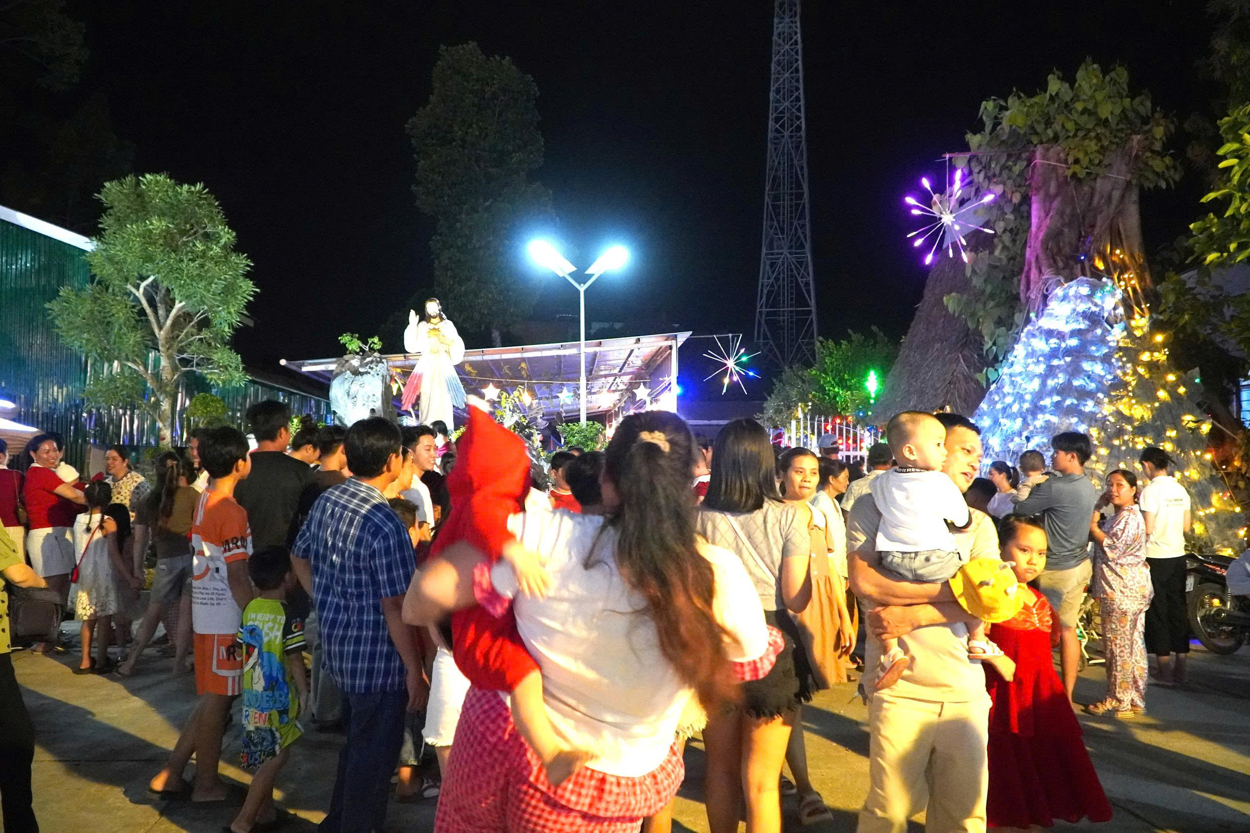 Ngay từ đầu giờ tối, khu vực quanh Nhà thờ trở nên nhộn nhịp với dòng người đổ về tham quan, vui chơi và ghi lại những khoảnh khắc đáng nhớ trong đêm Noel. Không gian Nhà thờ được trang hoàng rực rỡ với hang đá Giáng sinh, hệ thống đèn nhiều màu sắc và các tiểu cảnh mang đậm sắc màu lễ hội. Khung cảnh lung linh, gần gũi đã trở thành điểm check-in ấn tượng, thu hút nhiều gia đình, các bạn trẻ và du khách đến tham quan, chụp ảnh lưu niệm.