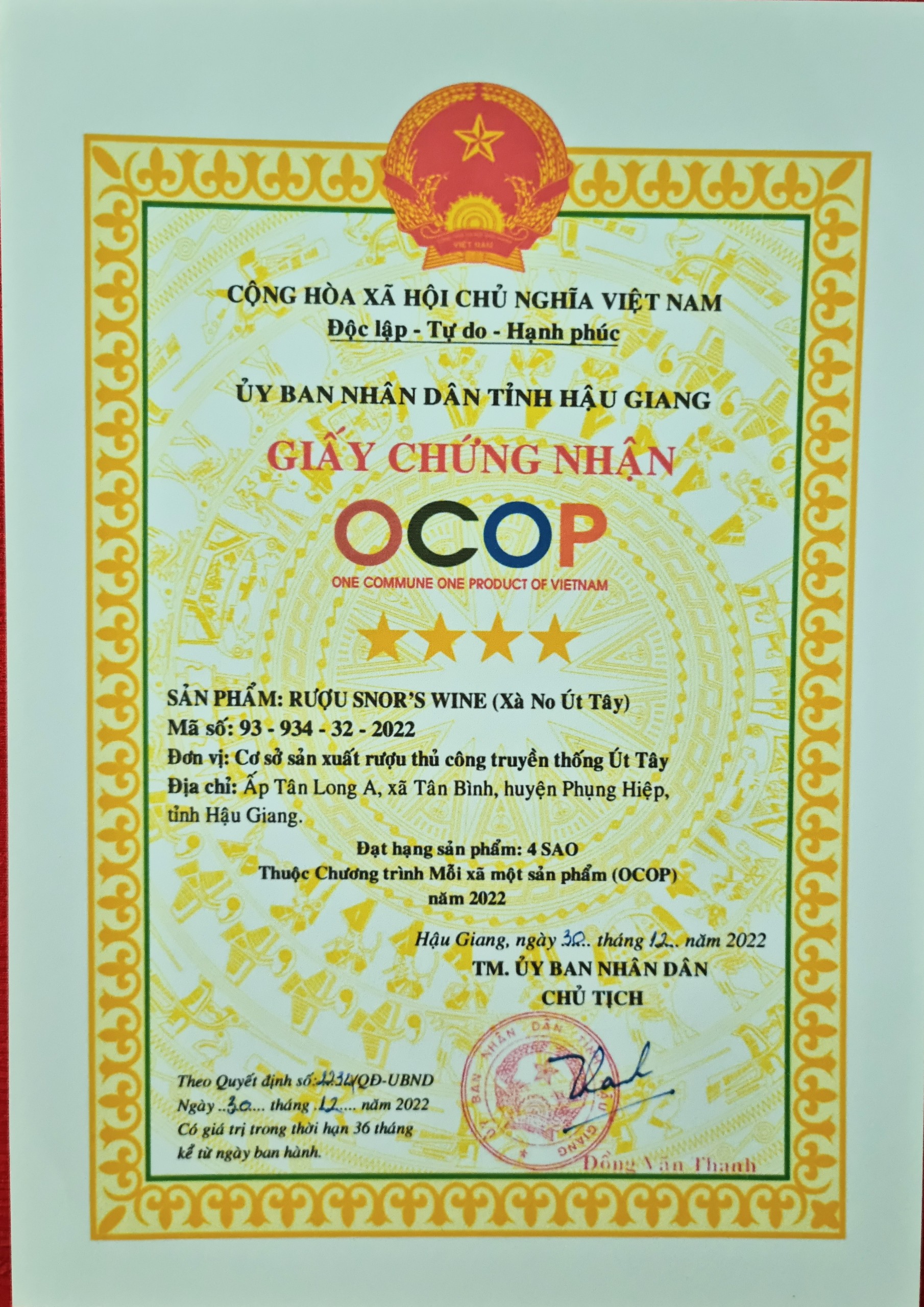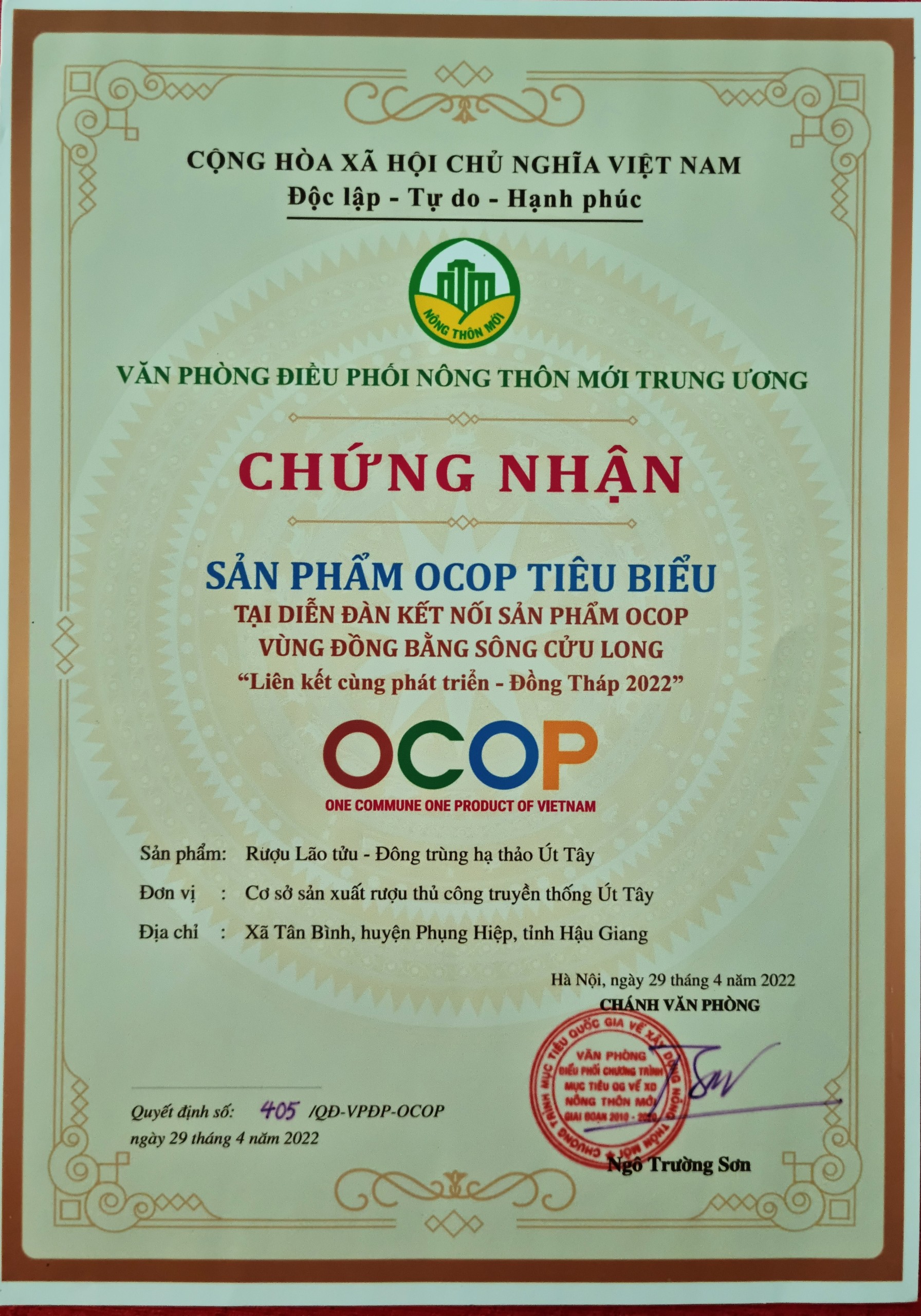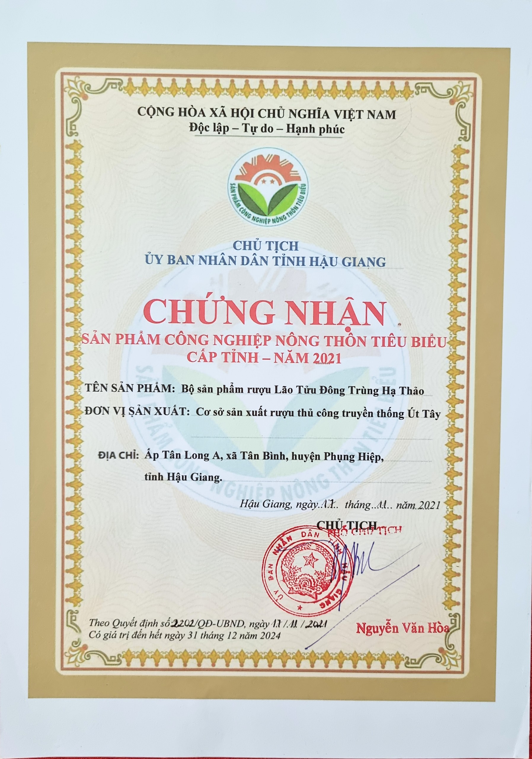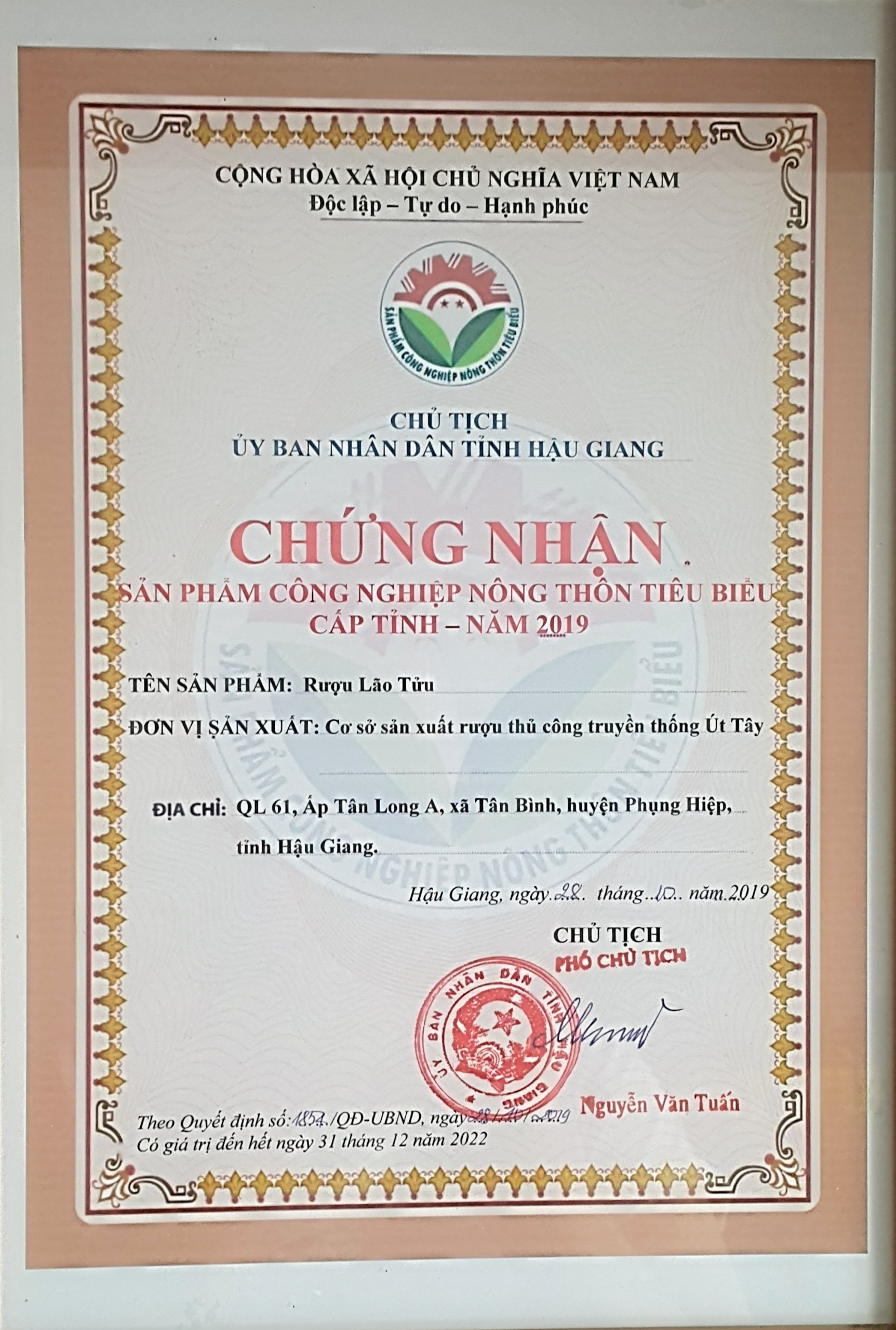 Cơ sở sản xuất rượu thủ công truyền thống Út Tây gần đây đã được biết đến với những sản phẩm rượu được chứng nhận sản phẩm OCOP 4 sao trong năm 2020, cũng như chứng nhận sản phẩm công nghiệp nông thôn tiêu biểu Hậu Giang năm 2021