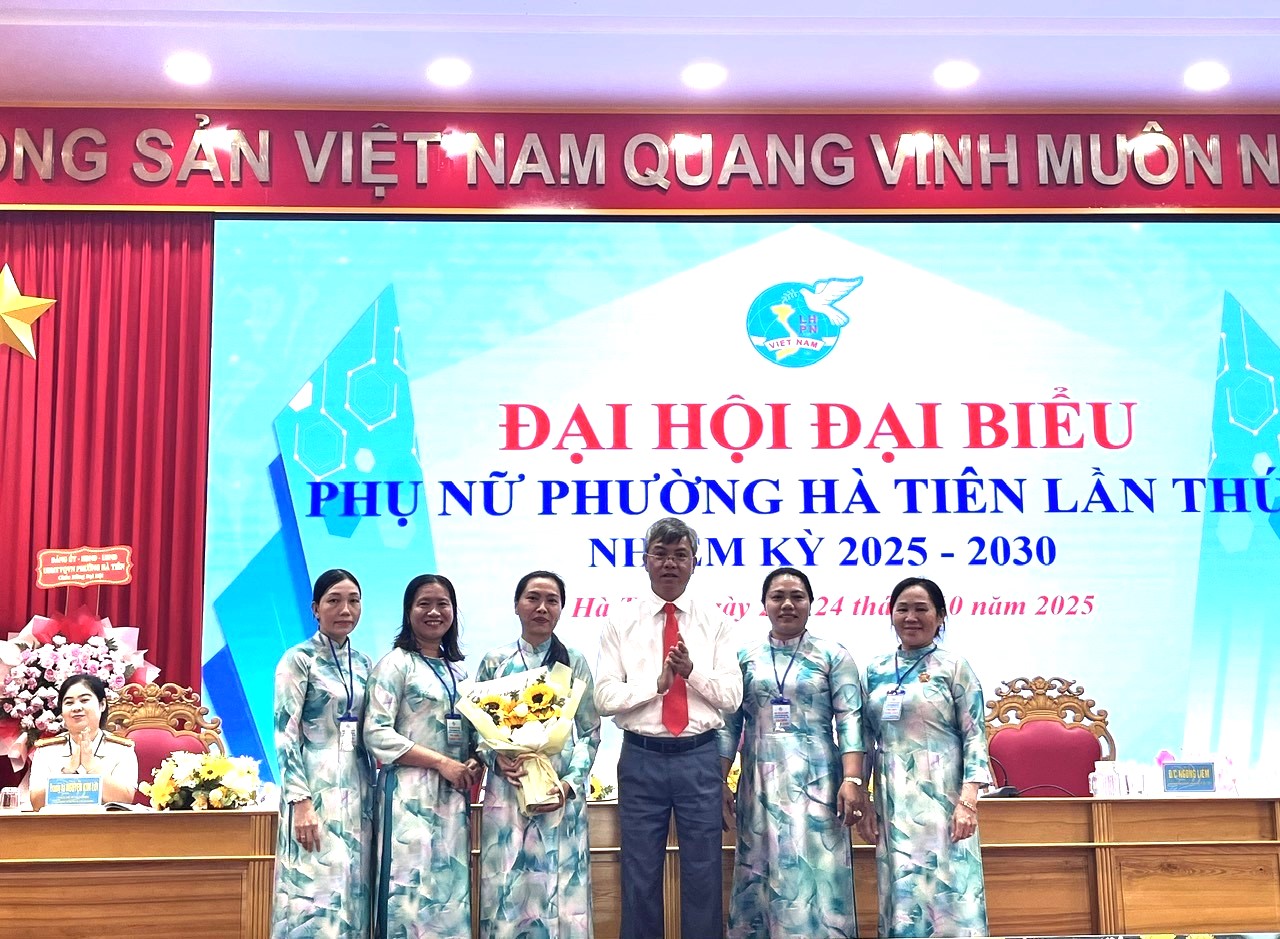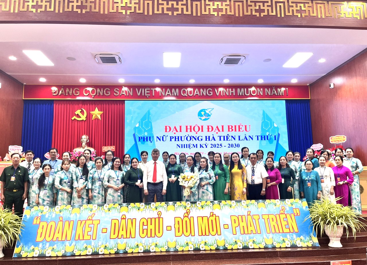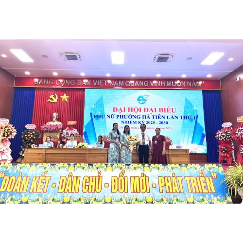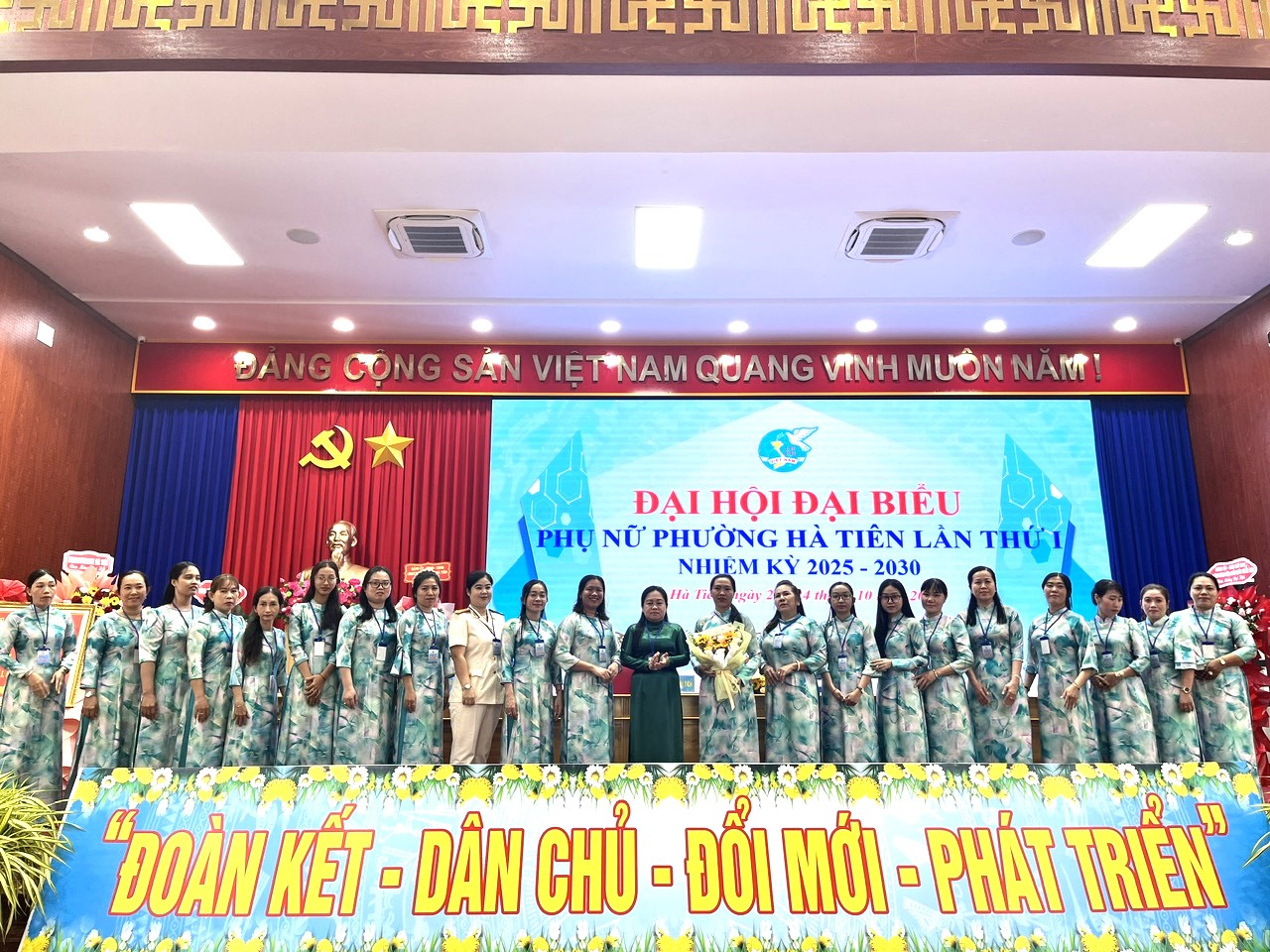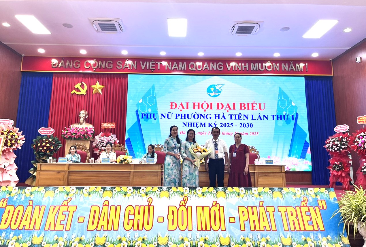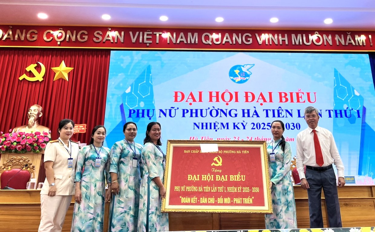 Dịp này, Ban Chấp hành Đảng bộ phường Hà Tiên tặng Đại hội và Hội LHPN phường Hà Tiên khóa I, nhiệm kỳ 2025-2030 bức trướng với chủ đề "Đoàn kết - Dân chủ - Đổi mới - Phát triển".