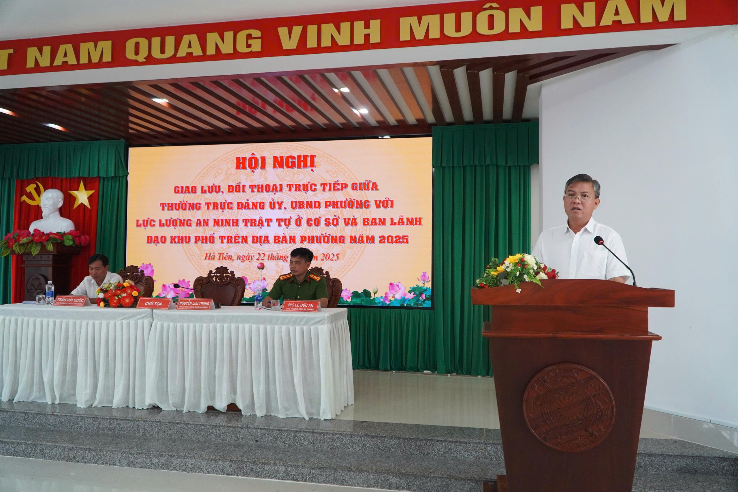 Sáng ngày 2210 Đảng ủy Ủy ban nhân dân phường Hà Tiên tổ chức Hội nghị giao lưu đối thoại trực tiếp với lực lượng an ninh trật tự cơ sở và Ban lãnh đạo các khu phố trên địa bàn phường Dự hội nghị có các đc Nguyễn Lưu Trung Tỉnh ủy viên Bí thư Đả