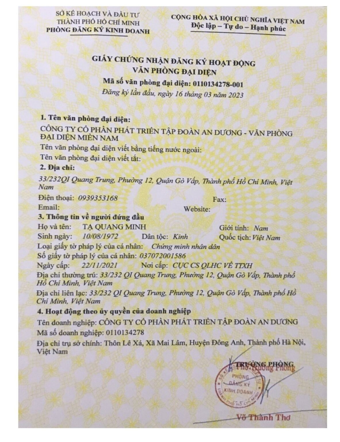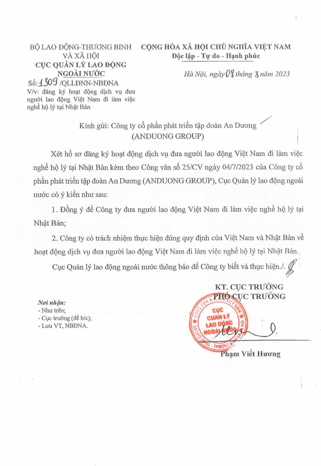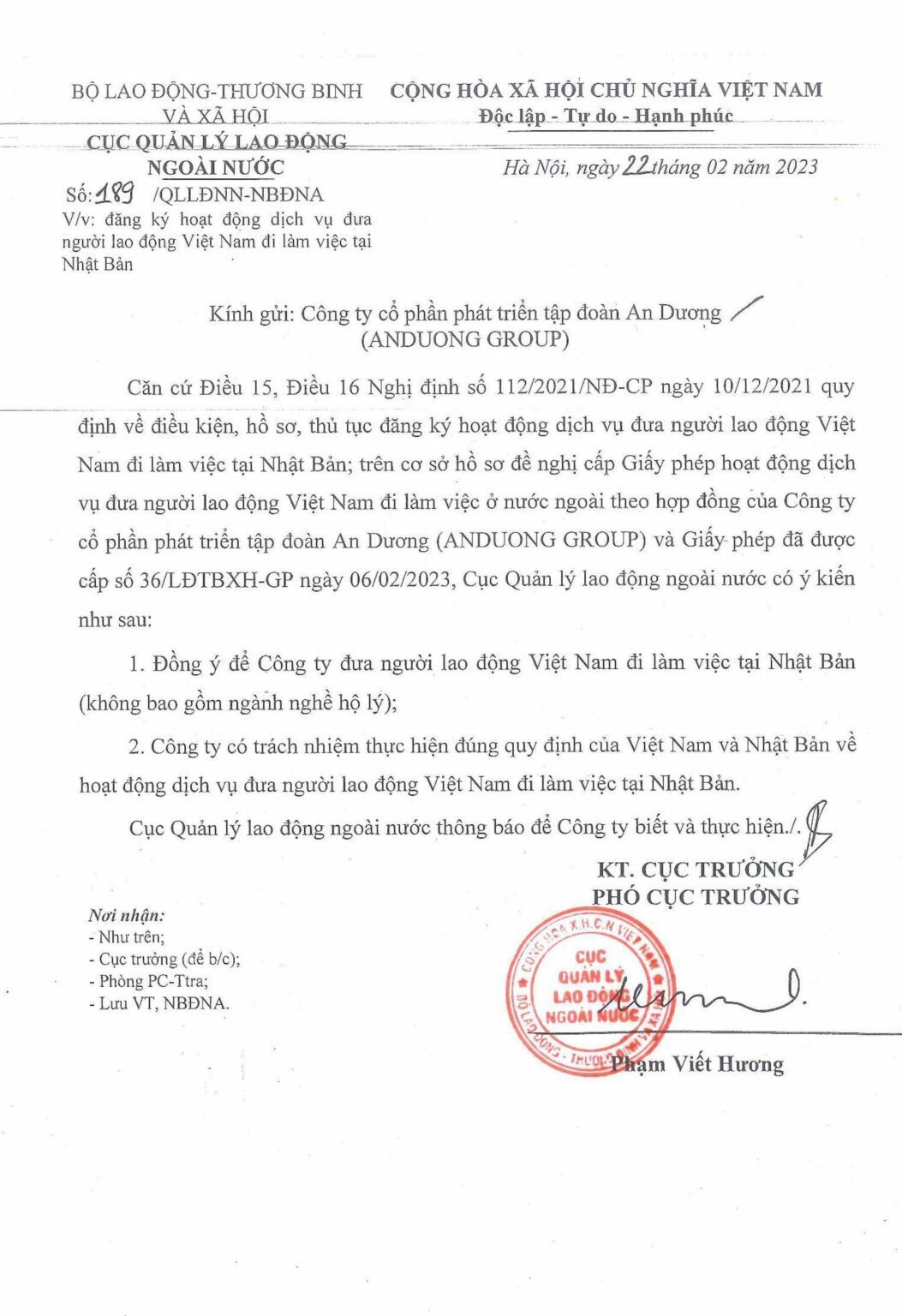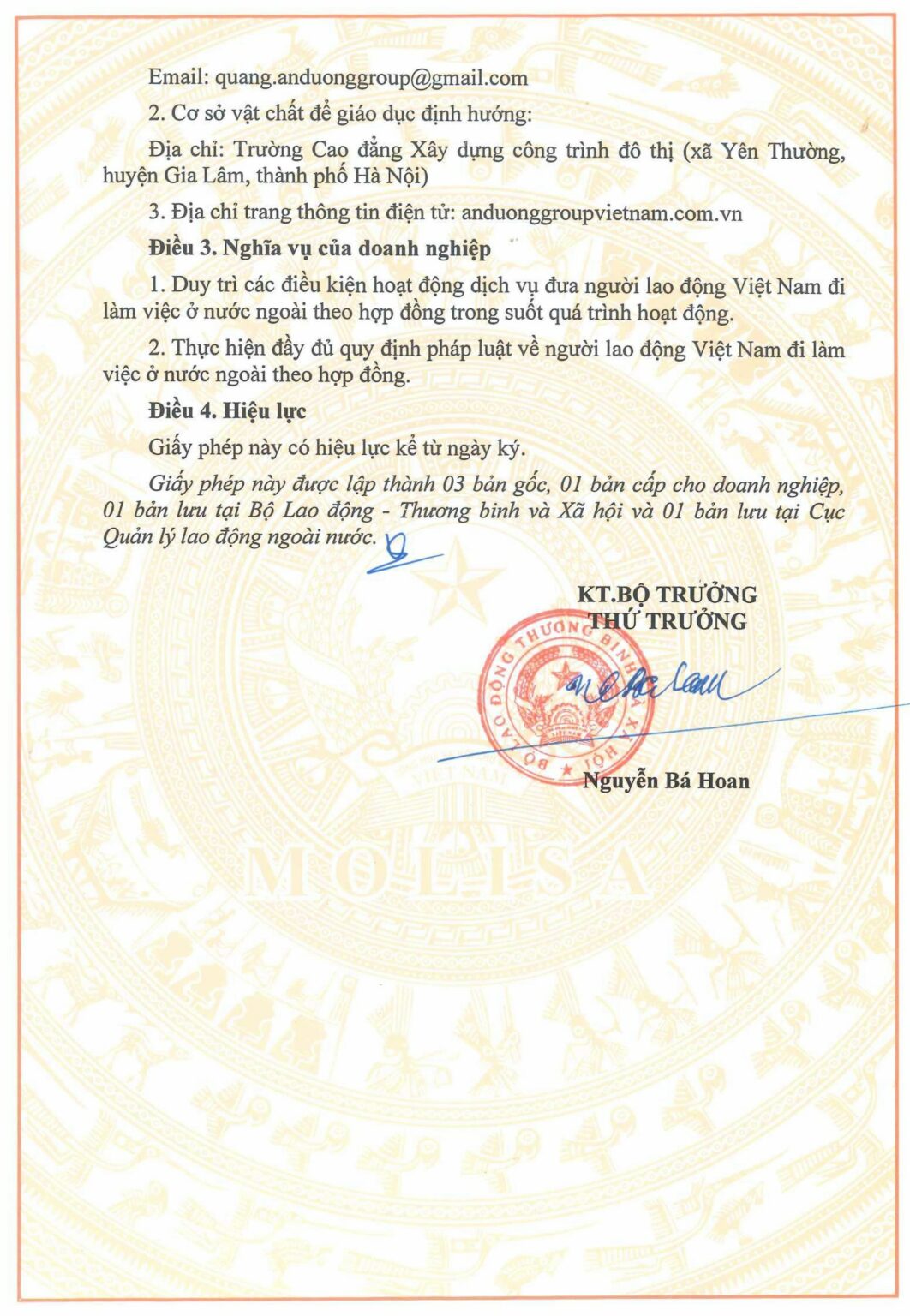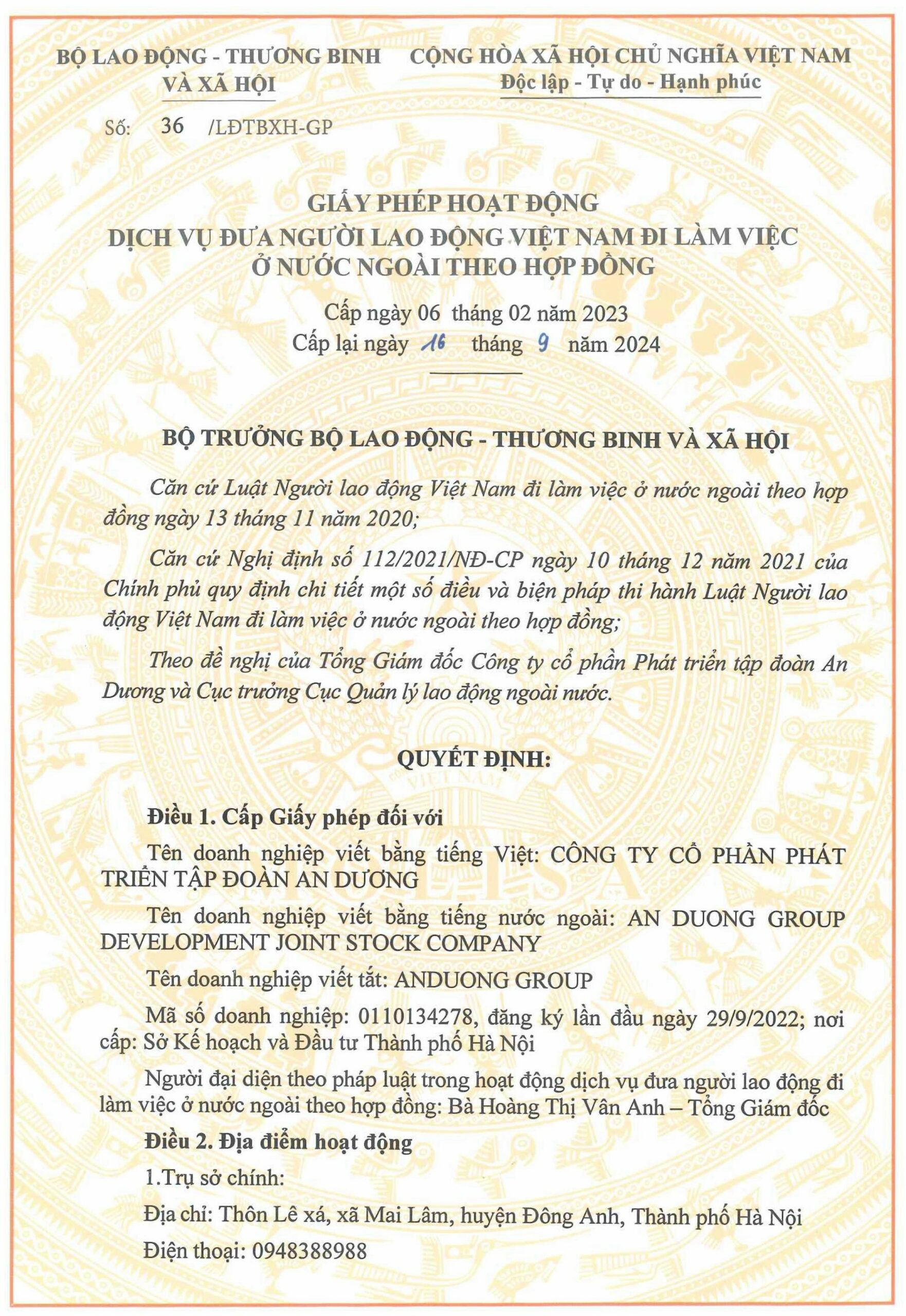 An Dương Group hoạt động hợp pháp theo quy định của pháp luật Việt Nam với tên pháp lý là Công ty Cổ phần Phát triển Tập đoàn An Dương, được cấp đăng ký kinh doanh bởi cơ quan có thẩm quyền. Chúng tôi sở hữu đầy đủ giấy phép hoạt động trong các lĩnh vực liên quan, đặc biệt là giấy phép dịch vụ đưa người lao động Việt Nam đi làm việc ở nước ngoài theo hợp đồng, đảm bảo mọi chương trình, dịch vụ triển khai đều minh bạch, đúng pháp luật và bảo vệ tối đa quyền lợi của người lao động, đối tác và khách hàng. Toàn bộ thông tin pháp lý, trụ sở và văn phòng đại diện của công ty được công khai rõ ràng, thể hiện cam kết hoạt động chuyên nghiệp, uy tín và bền vững của An Dương Group.
