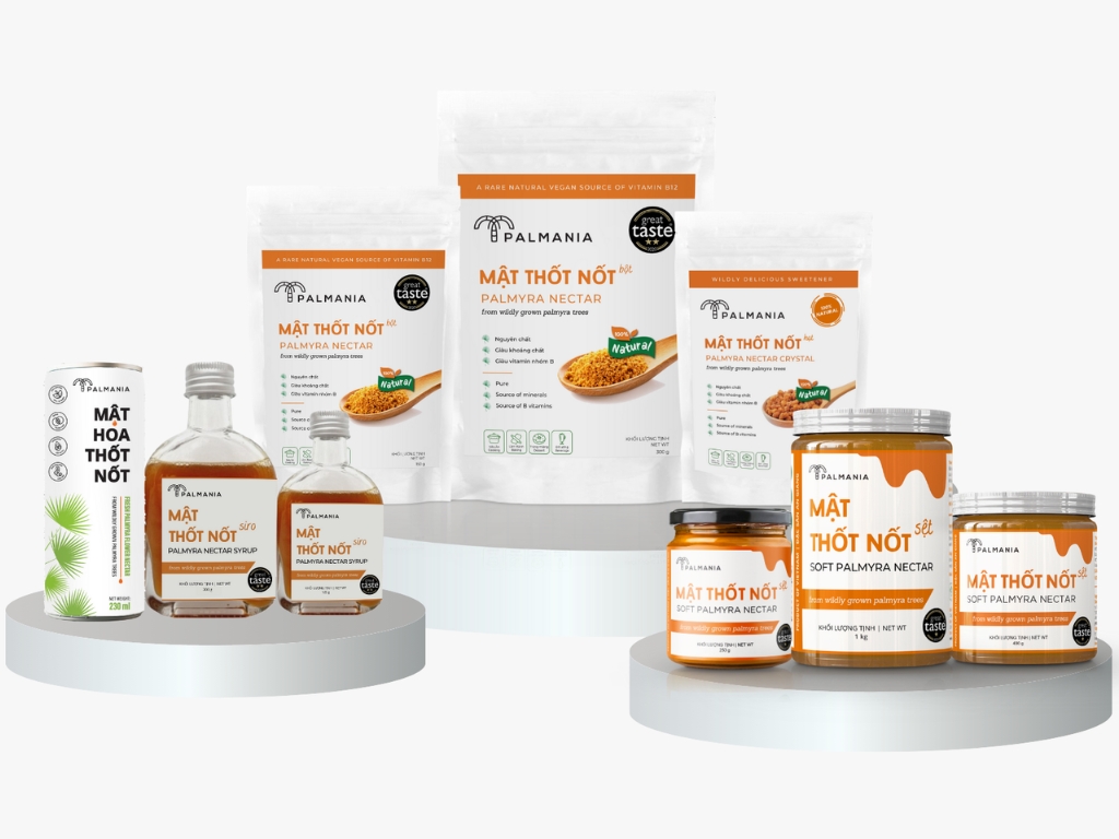 Các sản phẩm mật thốt nốt Palmania, bao gồm mật thốt nốt, mật thốt nốt hạt, mật thốt nốt sệt truyền thống và si-rô mật thốt nốt, đều tinh khiết, tự nhiên, chưa qua tinh luyện và ngon tuyệt